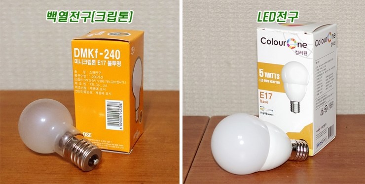 왼쪽에 있는 것이 기존에 식탁등과 욕실등으로 사용했던 40W 크립톤 전구입니다. 식탁등에는 3개, 욕실등에는 2개 사용하고 있었습니다.