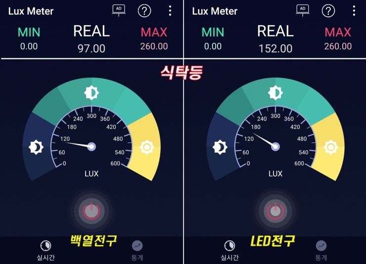 측정 결과 백열전구는 97룩스, LED 전구는 152룩스였습니다. LED 전구가 백열전구보다 57% 정도 밝습니다.