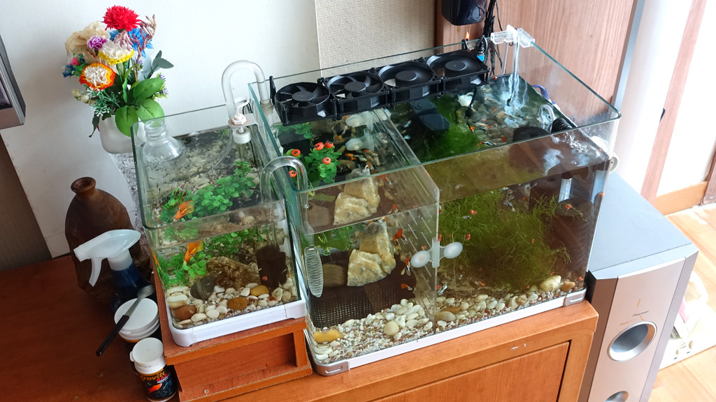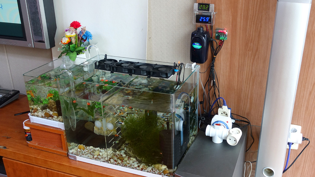 어항에 장착한 모습입니다. 이 냉각팬은 기화열에 의하여 물의 온도를 낮춥니다. 이 냉각팬을 동작시키면 어항 물의 온도를 2~3도 정도 낮출 수 있습니다.