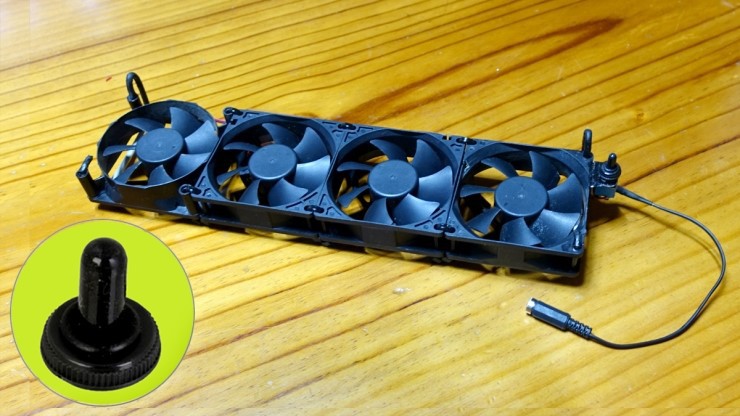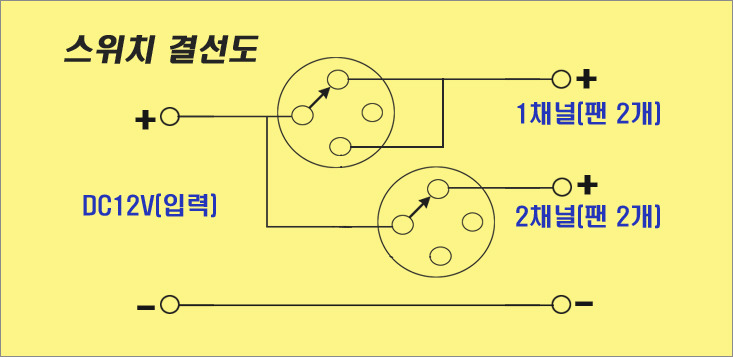 스위치를 올리면 냉각팬 4개가 켜지고, 중간은 꺼지고, 아래로 내리면 2개가 켜지도록 2채널 토글스위치를 씁니다. 결선도는 위와 같습니다.