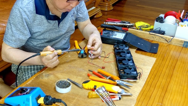 위 사진은 냉각팬에 달 스위치를 만들고 있는 모습입니다.