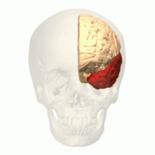 측두엽(초록), 후두엽(빨강), 두정엽(노랑)이 포함된다.