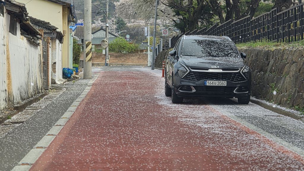 퇴근길 만옥정 벚꽃을 한번이라도 더 보고 싶어 가보니 헐~ 벌써 꽃비가 되어 (눈이 흩날리는 것처럼) 바닥에 쌓인다.