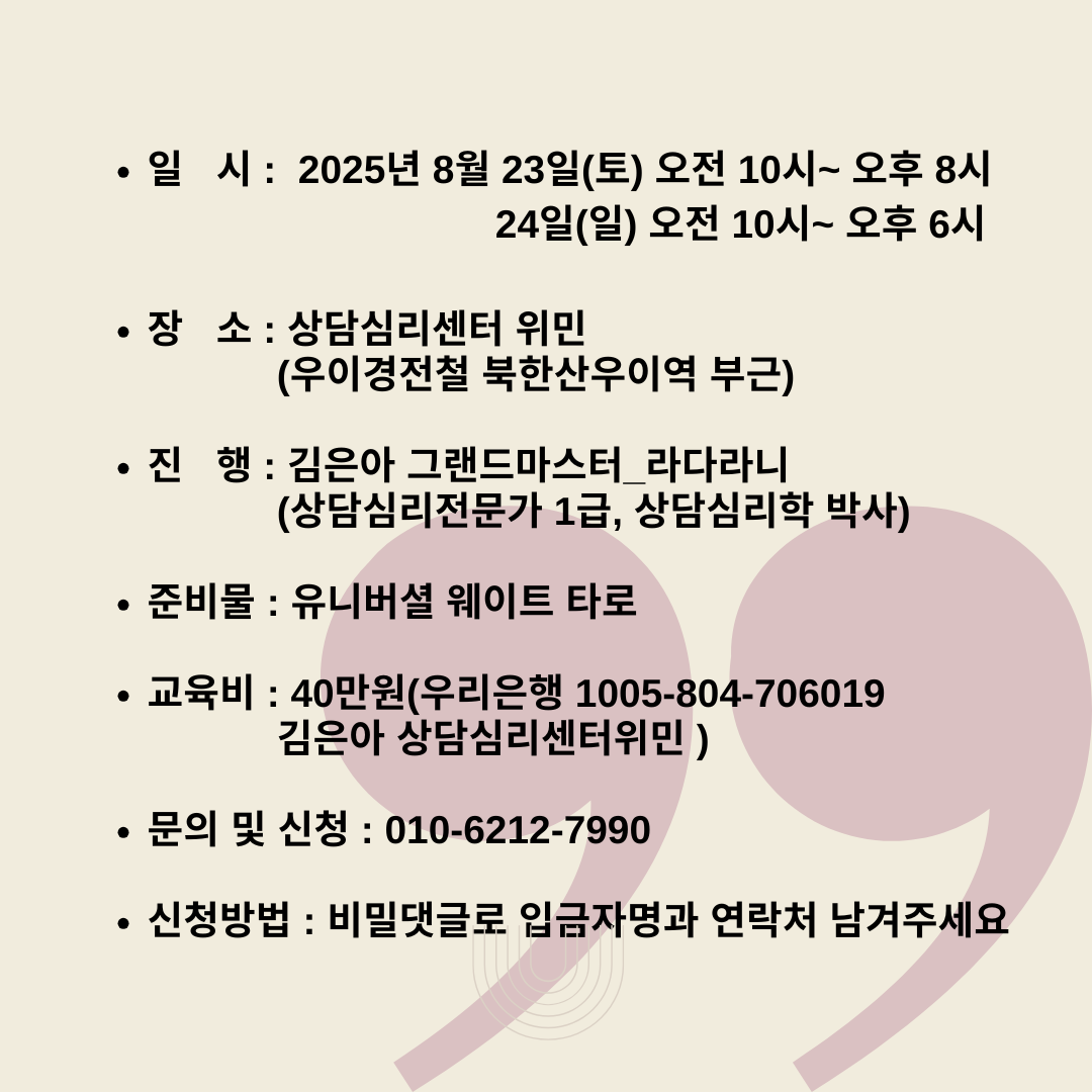 - 타로교육비 : 40만원(우리은행 1005-804-706019 김은아 상담심리센터위민)