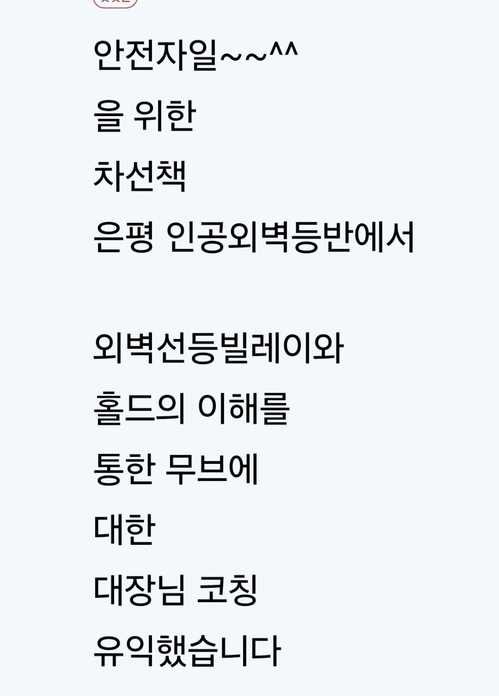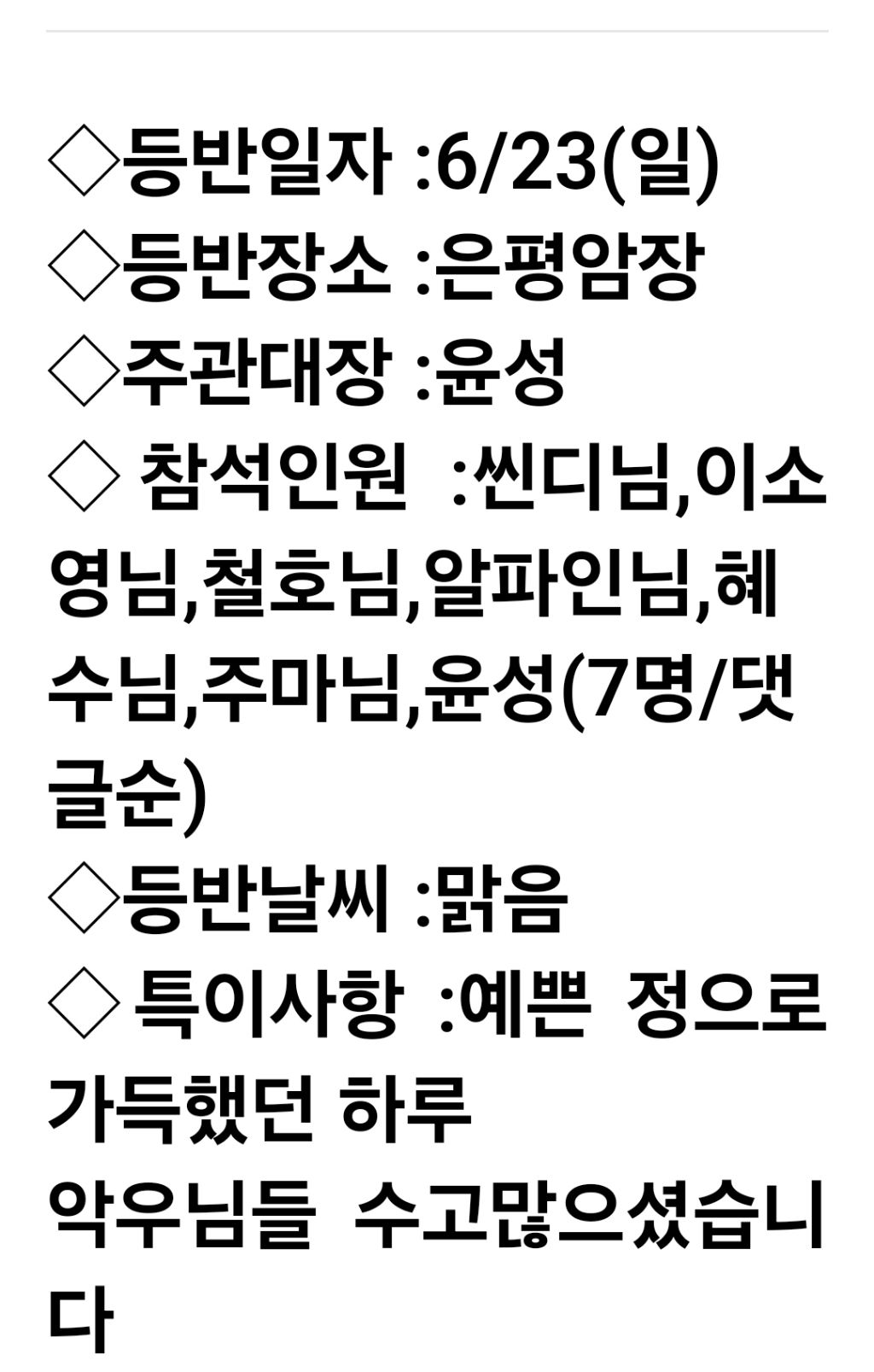 24년6/23일 은평암장 작성자씬디|작성시간24.06.23|조회수7 목록 댓글 0 글자크기 작게가 글자크기 크게가 인수봉에서은평외벽으로~~^^ 다음검색 현재 게시글 추가 기능 열기 북마크 공유하기 신고 센터로 신고 댓글 댓글 0 댓글쓰기 답글쓰기 댓글 리스트