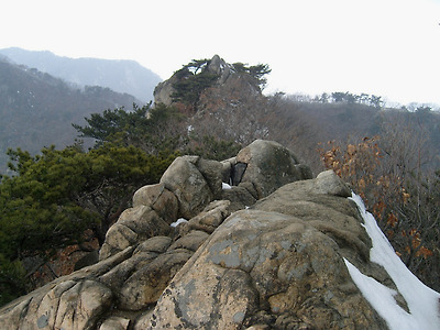 그 다음 암봉을 올라서는 길은 약간 왼쪽으로 몇발자욱 내려서서 크랙을 잡고 오르면 된다.