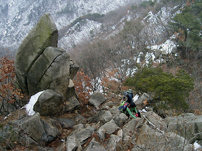 곧장 암릉을 따라 내려서도 되지만 V자로 이루어진 마지막 바위를 넘어 내려설 때는 중심을 잃지 않도록 뒤돌아서서 조심스레 내려서야 한다.