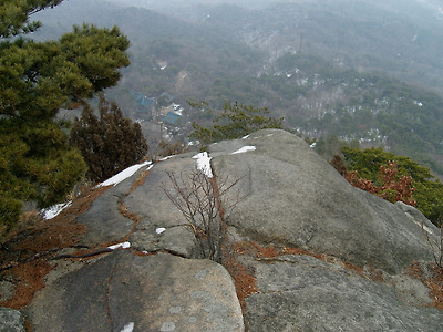 성벽을 내려서서 4~5분 내려서면 오른쪽으로 산길이 휘어져내리는 지점 바로 위에 전망바위가 있다.