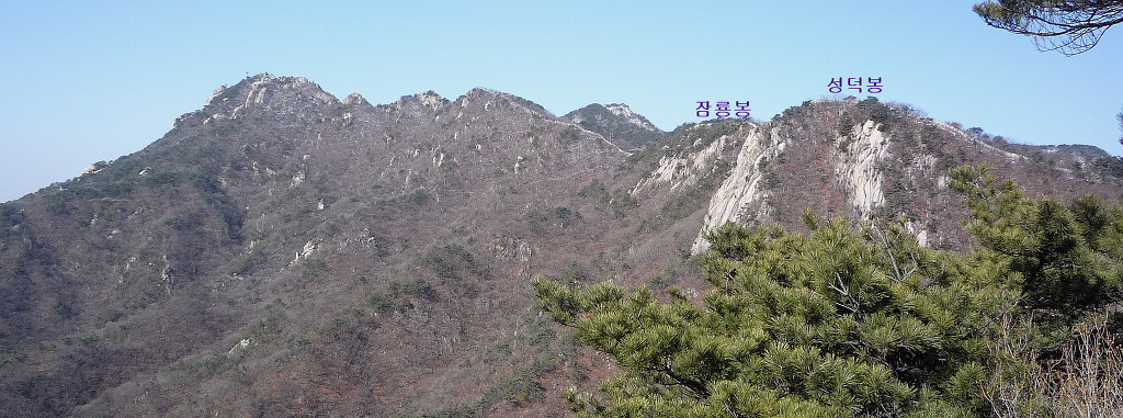 <칼바위에서 바라본 문수봉 방면 조망-성덕봉 뒤로 대성문까지 화룡봉과 잠룡봉 두 봉우리가 있는데, 성덕봉에 가려 보이지 않는다>