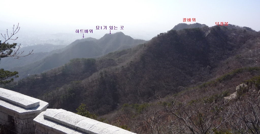 <묘지를 지난 사면길에서 본 칼바위-왼쪽 뒤 바위가 드러난 봉우리는 성덕봉, 그 옆은 잠룡봉>