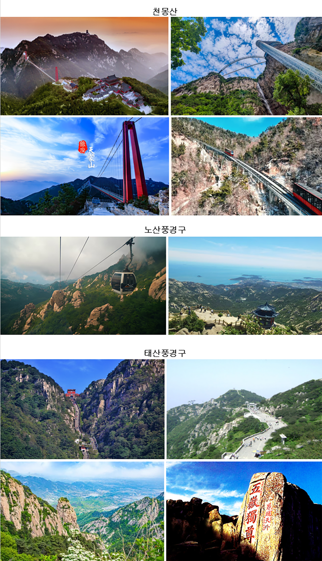 초보 및 일반 관광객은 케이블카를 이용하여 천하명산(태산*노산*천몽산)을 두루 탐방*관광할수 있습니다