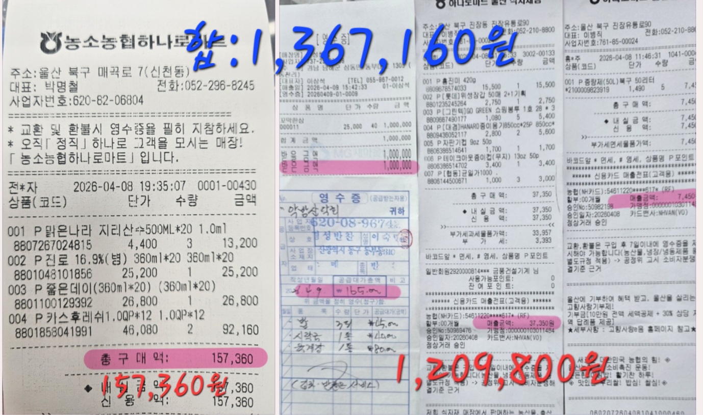 | 재정보고 내용 | ☆수입내역: ▪️55,000×40=2,070,000원 (부부할인2팀,주관대장 총무 회비면제) ▪️현금찬조: 산울림회장님:10만원 반백직전회장님:5만원 쭌아고문님:5만원 ☆총수입: 2,270,000원 ▪️물품찬조내역: 엔돌핀님:한라봉2박스 이숲부회장님:단팥빵45개 배즙45개 ☆지출내역: ▪️버스임대료+얼음:1,120,000원 ▪️석식:1,000,000원 ▪️조식:165,000원 ▪️주류,생수:157,360원 (그외 마트물품구매 영수증참조) ☆총지출:2,487,160원 (-217,160원):재정지원 ☆카페 이월잔액금: 8,223,057원 ▪️3월21일 :함양오르고 버스10만원(재정지원) ▪️4월1일:비진도버스10만원(재정지원) ▪️3월29일: 재정통장이자163(입금) 결산소득세20원(출금) ▪️4월1일비진도잔액입금:12,900원 ▪️4월8일강동사랑길잔액입금:9,000원 ☆카페 현잔액금:7,827,940원 |