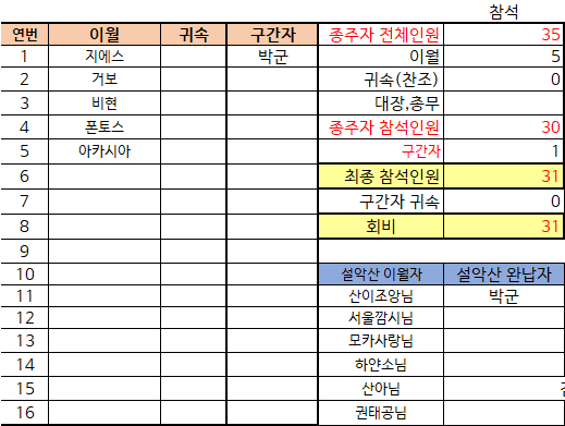| 백두대간 16기 좌석 배정표 | ||||||||
