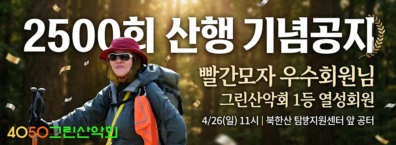 | ◆ 산행 소개 : 2,500번의 발걸음이 만든 기적 한 걸음, 한 걸음 묵묵히 산을 오른 지 어느덧 2,500회. 비바람에도, 뙤약볕에도 흔들림 없이 정상을 향했던 그 의지와 열정이 오늘, 전설이 되었습니다. 이 경이로운 대기록을 함께 축하하고자 합니다. 가슴 벅찬 이 자리를 더욱 빛내주실 여러분의 많은 참석을 간절히 바랍니다. 빨간모자 우수회원님의 2,500회 산행을 축하합니다. |