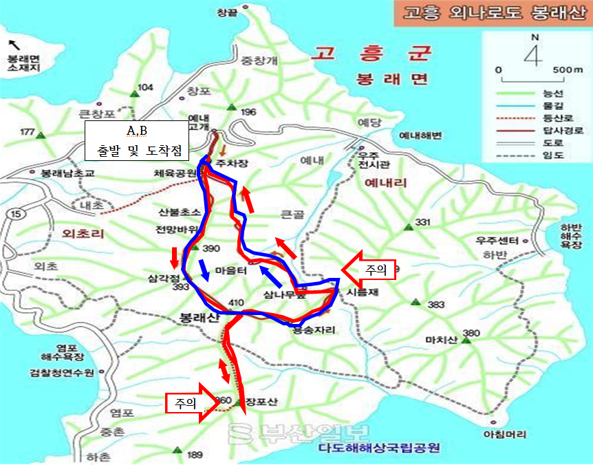 B : 무선기지국-봉래산-시름재-삼나무숲체육공원-무선기지국