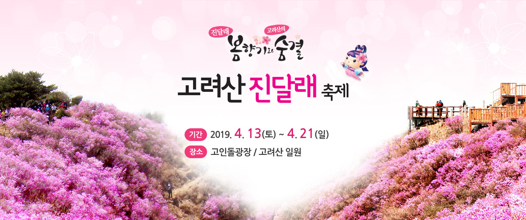 진달래 봄향기와 고려산의 숨결 고려산 진달래 축제 기간 : 2018.4.14 (토) ~ 4. 22 (일) 장소 : 고인돌광장/고려산 일원, 체험행사 : 진달래 체험전, 진달래 핸드폰 사진전, 진달래 엽서전