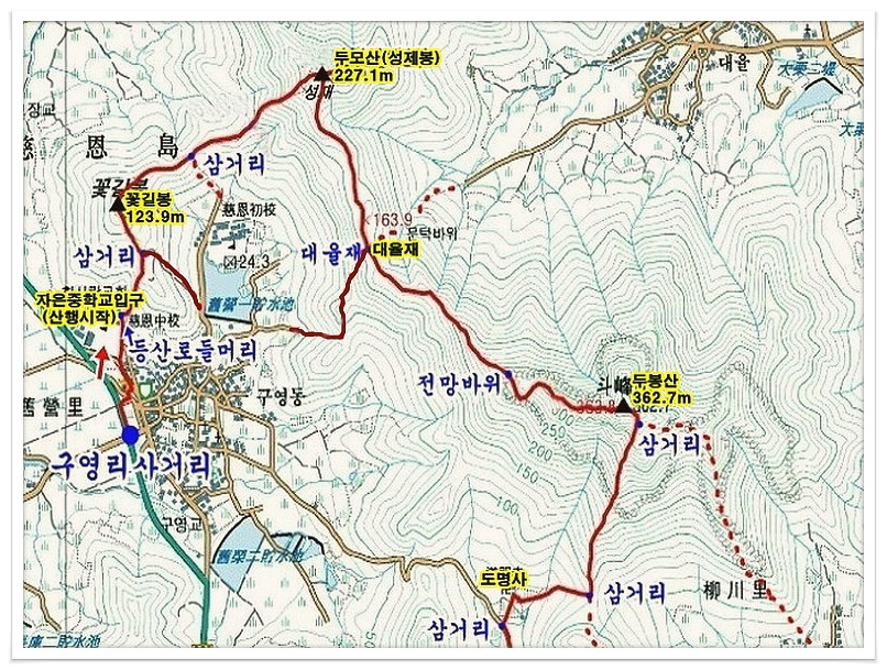 찍고 원점회귀한다. 보폭을 빨리하면 2시간 30분 안쪽에 오갈 수 있다. 들머리는 구영리(舊營里)다.