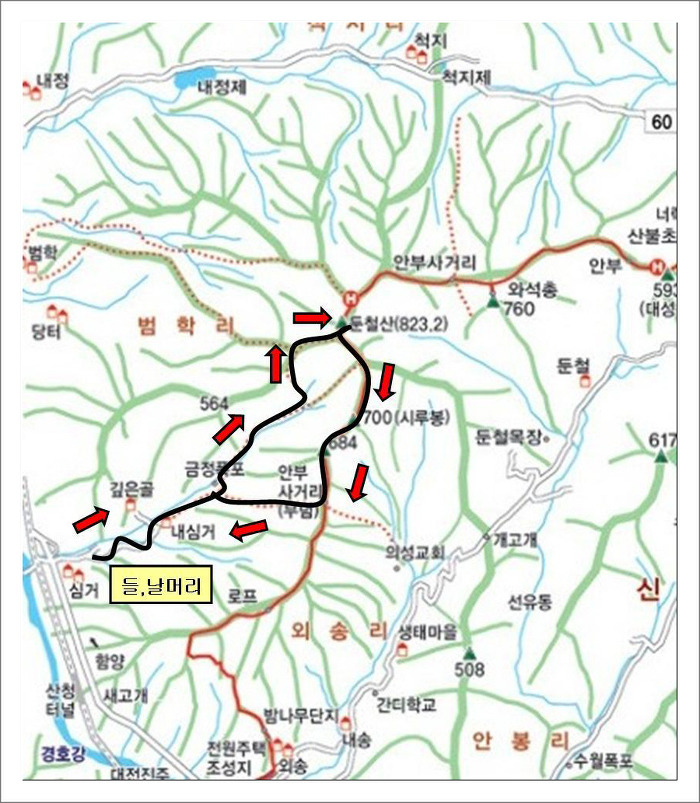 산행코스:심거마을→내심거마을→금정폭포→둔철산→