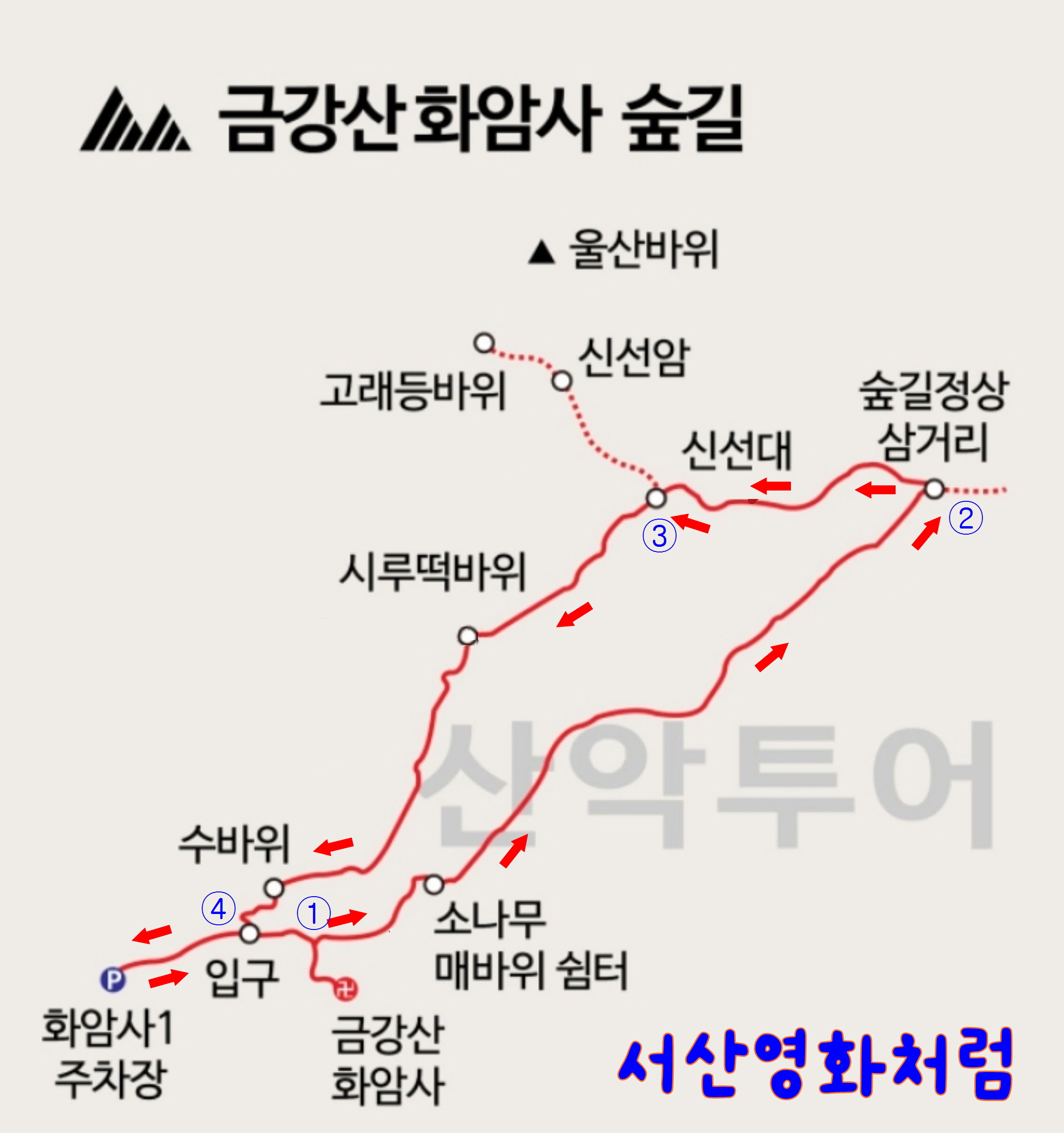 (들머리)화암사주차장 → 숲길입구(화암사다리건너기전) → 산림치유길 →