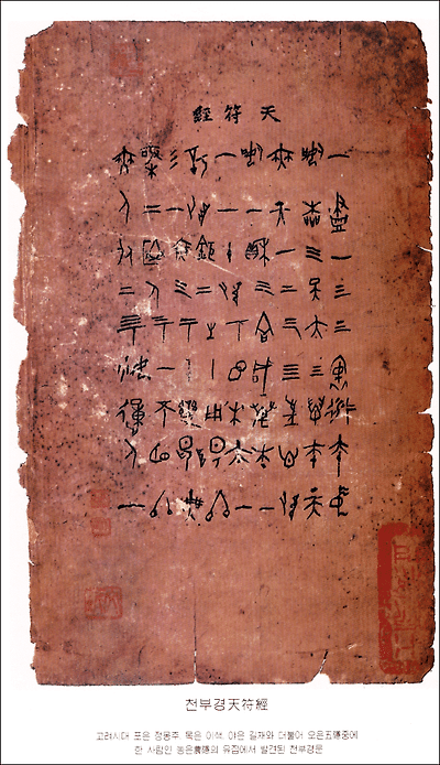 한편 천부경(天符經)은 한민족 최고(最古)의 나라로 알려진 환국(桓國)에서 비롯, 구전되어 오던중 환웅(桓雄)의 명에 의하여 신지(新誌) 혁덕(赫德)에 의하여 최초로 녹도문(鹿圖文)으로 기록되었고, 후에 신라(B.C57∼A.D935)의 최치원이 옛비석에서 신지(新誌:단군시대 천황의 명령과 출납를 전담하다가 혁덕 이후 기록을 담당했던 벼슬이름. 앞의 신지 혁덕과는 다른 사람)가 쓴 전자(篆字) 고각본(古刻本)을 찾아내어 그것을 다시 첩(帖)으로 만들어 세상에 전하게 된 것이다.