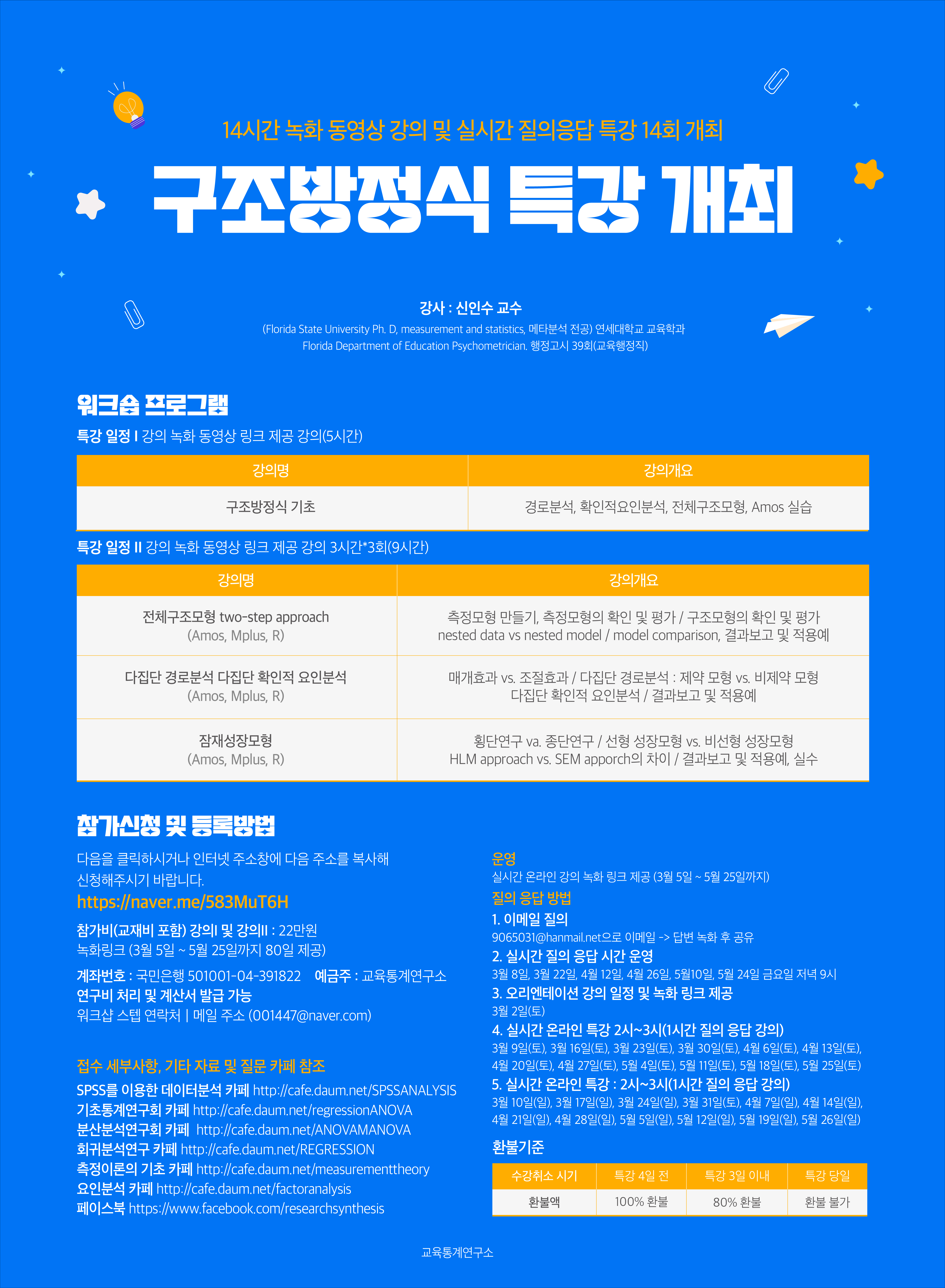 구조방정식을 한마디로 하면 경로분석과 확인적 요인분석의 결합이라고 할 수 있습니다. 경로분석과 회귀분석의 차이점은 회귀분석이 종속변수와 독립변수의 직접관계를 설명한다면, 경로분석은 간접효과, 즉 매개효과를 모형화 한다는 점입니다. 확인적 요인분석과 탐색적 요인분석의 차이점은 탐색적 요인분석이 요인구조를 모를 때, 요인의 수를 결정하기 위해 적용한다면, 확인적 요인분석은 요인구조를 알고 있을 때, 데이터의 적합성에 대한 통계적 평가를 위해 적용한다는 점이 차이점입니다. 따라서 구조방정식은 경로분석과 확인적 요인분석을 동시에 적용하는 것입니다. 구조방정식의 가장 큰 특징은 전체모형에 대한 검정을 우선시 한다는 것입니다. 구조방정식의 선수과목은 기초통계, 분산분석, 회귀분석 등이라고 할 수 있는데, 이러한 방법론에서는 개별모수(평균, 상관, 회귀계수 등)에 대한 가설검정을 주로 했습니다. 하지만, 구조방정식에서는 개별모수 보다는 전체모형에 대한 평가를 우선시 합니다. 그리고 전체모형에 대한 이론적 근거나 이론모형이 무엇보다 중요합니다. 연구자의 연구문제에 대한 통찰력과 선행연구에 대한 철저한 분석이 필요한 이유입니다. 전체모형에 대한 평가를 하는데 있어서 영가설을 이해하는 것을 저는 매우 중요하게 생각합니다. 구조방정식을 적용하여 논문을 쓰고자 하는 대학원생, 유학생, 연구자는 구조방정식의 영가설, 즉 “관찰된 공분산 행렬은 모형에 의해 재 생성된 공분산 행렬과 같다”의 의미를 잘 알고 적용하는 것이 중요합니다. 구조방정식이 사회복지, 행정학, 교육학 등 사회과학분야의 석박사 논문에서 아주 많이 사용되고, 다층모형과 함께 기관에서 수집한 패널데이터 분석에서 주로 사용되고 있습니다. 요즘에는 의료분야에서도 삶의질(quality of life)에 대한 관심이 증가하고, 건강보험 데이터가 공개되는 등으로 인해 의료분야에서도 점차 적용빈도가 증가하고 있습니다. 다만, 일종의 양적연구 종합선물세트라고 할 수 있는 구조방정식에 대한 기본적인 이해가 부족한 상태에서 석박사논문이나 학술지를 작성하는 경우가 많습니다. 기본서를 한권 정해서 충분히 읽고 그 다음에는 관련 전공 분야의 좋은 저널에 실린 최근 구조방정식 논문을 최소한 10개 이상 여러 번 읽으면서 구조방정식의 기본개념, 절차, 적용논리를 학습하시기 바랍니다. 참가신청 및 등록방법 ● 다음을 클릭하시거나 인터넷 주소창에 다음 주소를 복사해 신청해주시기 바랍니다. https://naver.me/583MuT6H |