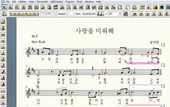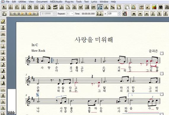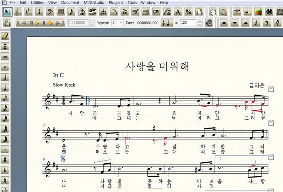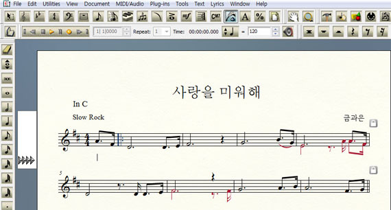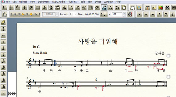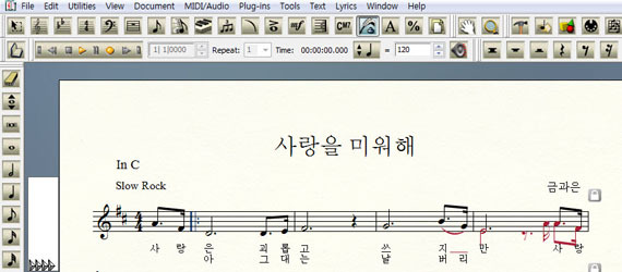 않게 왼쪽 화살표를 이용해 상,하 위치 조정을 해 주십시요(만약 오선의 간격이 조밀해서 2절 가사 입력이