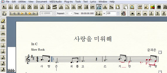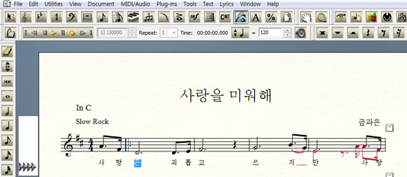 도 이와 같은 방법으로 작성 할 수 있겠습니다 위치된 커서에 가사를 하나하나 채워 갑니다 가사가 1절과 부딪히지