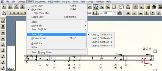 역시 붉은 음표에는 붉은 가사를(예를 들면) 입력 해야 하므로 이 음표들을 입력한 Layer 2를 찾아야 하겠죠?