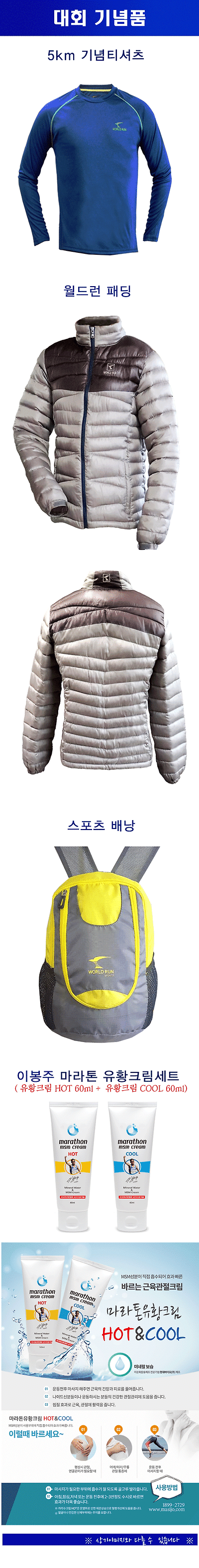 | 구 분 | 종 목 | 참가금 | 기 념 품 | 제한시간 | 비 고 | | 5km | 5km | 20,000원 | 기념티셔츠, 완주메달, 기록증 | 1시간 | 칩사용 | | 일반 | 10km | 35,000원 | 스포츠배낭 또는 유황크림세트 중 택1 기록증, 완주메달 | 2시간 | 칩사용 | | Half | 35,000원 | 스포츠배낭 또는 유황크림세트 중 택1 기록증, 완주메달 | 3시간 | 칩사용 | | 패딩 | 패딩 (10km) | 50,000원 | 월드런 패딩, 기록증, 완주메달 | 2시간 | 칩사용 | 패딩 (Half) | 50,000원 | 월드런 패딩, 기록증, 완주메달 | 3시간 | 칩사용 | | 매니아 | 매니아 (10km) | 25,000원 | 완주메달, 기록증 | 2시간 | 칩사용 | 매니아 ( Half ) | 25,000원 | 완주메달, 기록증 | 3시간 | 칩사용 | ◈ 매니아란? 기념품을 원하시지 않는 분들을 위해 마련한 제도 입니다 ◈ vip회원분들중 기념품을 원할경우 15,000원을 입금해주셔야 합니다 (패딩은 35,000원)