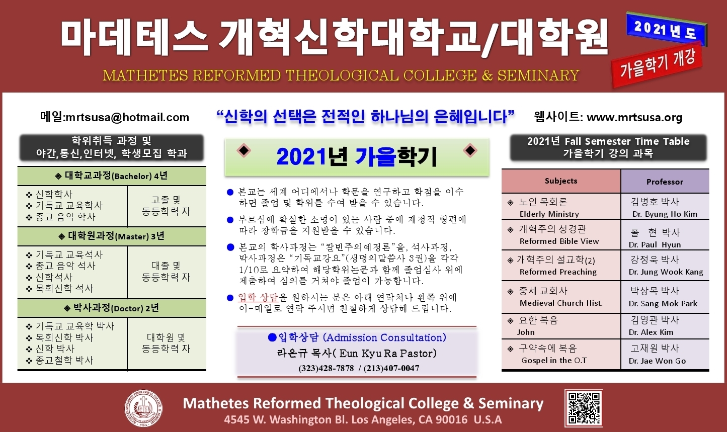 마데테스 개혁신학대학교/대학원 웹사이트 바로가기 = http://www.mrtsusa.org/index.php