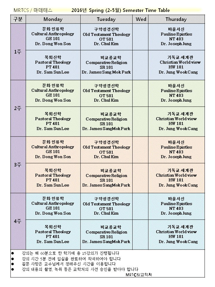 2016년 Spring (2-5) Semester Time Table 작성자소나무|작성시간16.01.16|조회수18 목록 댓글 0 글자크기 작게가 글자크기 크게가 다음검색 현재 게시글 추가 기능 열기 북마크 공유하기 신고 센터로 신고 댓글 댓글 0 댓글쓰기 답글쓰기 댓글 리스트
