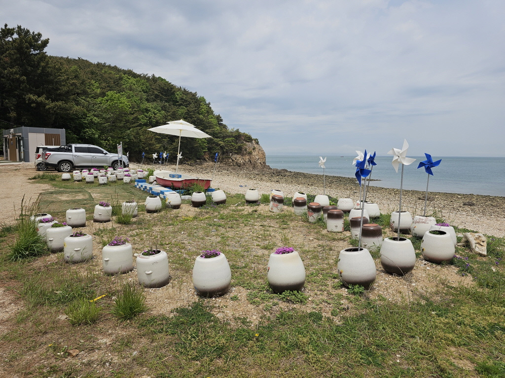 작은 해변에 작은섬해변의 작은까페가 보이고 작은배와 항아리로 만든 조형물들이 인상적이다.