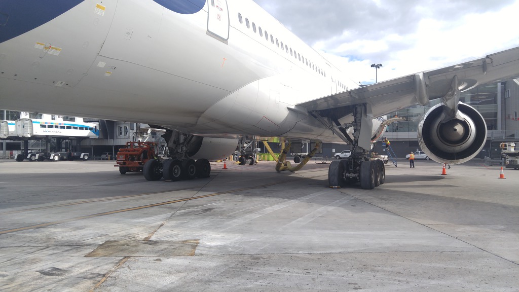 저의 파리 드골행 Air France Boeing 777-300ER 푸쉬백 장면입니다. 푸쉬백을 시작한 몬트리올 공항 55번 게이트 앞 택시라인은 꼬불꼬불해서 보잉 777급 비행기들은 푸쉬백이 은근 까다롭습니다.;;