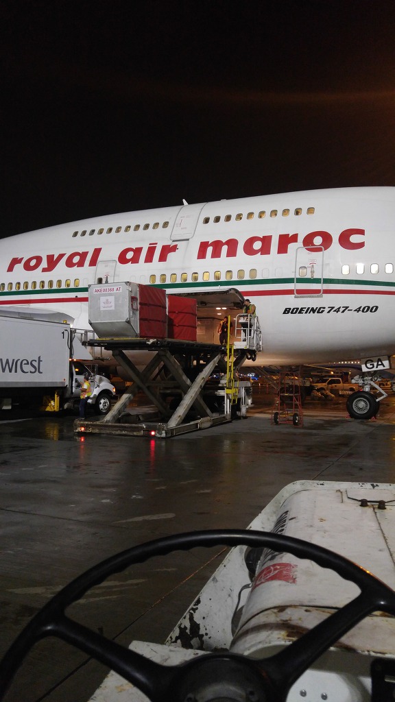 < 낡아빠진 Tug Tractor 에 앉아 찍은 Royal Air Maroc Boeing 747-400. 이런 트랙터들이 뒤에 트레일러를 여러개 주렁주렁 연결해서 컨테이너 및 화물 팔렛트들을 공항내에서 운송합니다. >