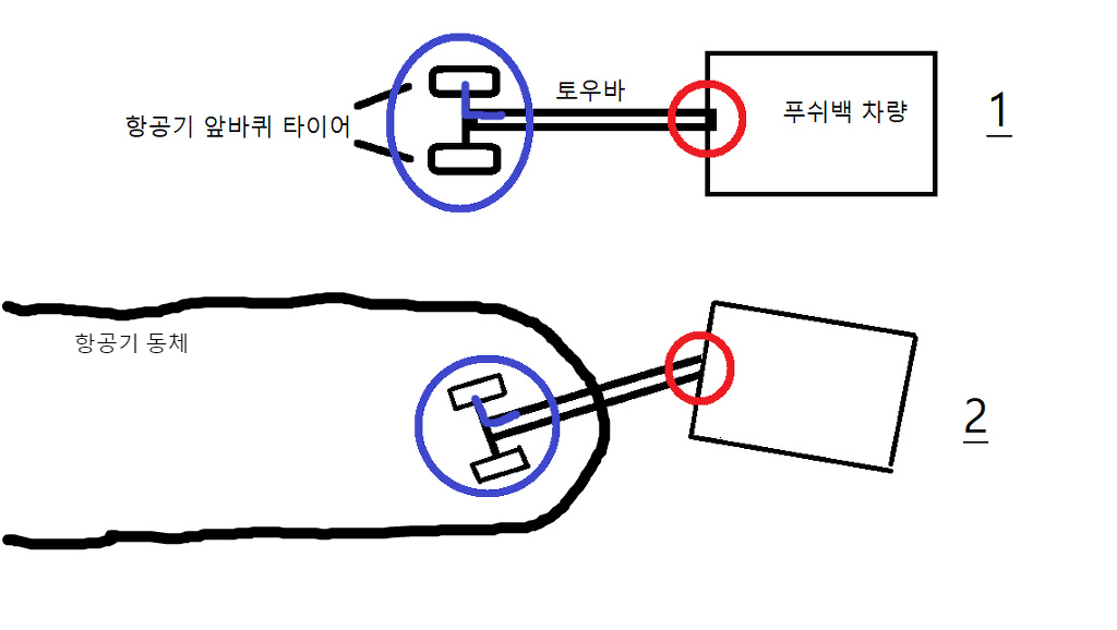 토우바를 이용한 푸쉬백은 개인적으로 하나만 신경쓰면 된다고 봅니다. 푸쉬백도중 복잡하게 생각할것 없이 바로 토우바와 푸쉬백 트랙터 연결부분의 각도만 조절하면 됩니다. (그림상 빨간색 원 부분) 그림상으로 파란색 부분인 항공기 노즈기어-토우바간의 각도는 신경쓸 필요도 없고 조절할수 있는것도 아닙니다. 보시는 바와 같이 항공기 노즈기어와 토우바 체결부분이 이루는 각도는 항상 직각입니다. 반면에 트랙터의 핸들을 돌리면 빨간색 부분의 각도가 틀어지게 됩니다. 푸쉬백 운전자 시점으로 트랙터를 오른쪽으로 움직이면 토우바가 오른쪽으로 틀어지면서 항공기의 노즈기어는 자연스럽게 조종사 시점 기준 왼쪽으로 틀어지죠. 왼쪽으로 틀어진 항공기의 노즈기어는 후진하는 항공기 꼬리를 푸쉬백 운전자 시점 기준 오른쪽으로 향하게 합니다. (반대 방향인 조종사의 시점으로는 꼬리가 왼쪽으로 향하게 되죠. 자동차 핸들을 왼쪽으로 돌리고 후진할때 앞바퀴들이 왼쪽으로 돌아감에 따라 자동차의 꼬리는 왼쪽으로 향하는것과 똑같은 원리입니다.)