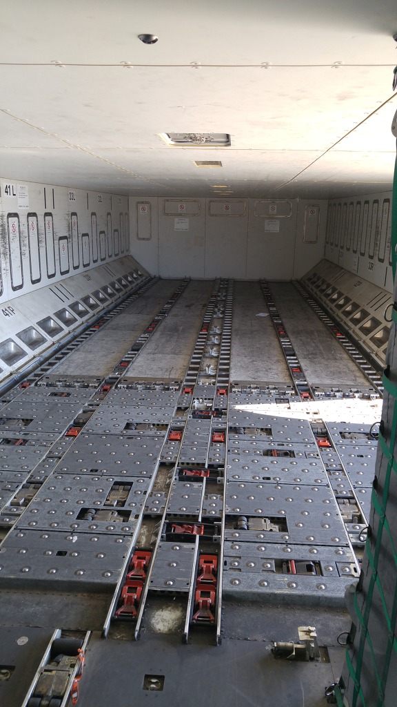 에어버스 A330 기종의 뒷 화물칸 입니다. 짐들을 하나하나씩 쌓아넣어서 그물로 고정시키는 소형기들의 Free-load 와는 다른 개념인 컨테이너 적재 방식을 대부분의 광동체 여객기들이 채택하고 있습니다. 승객 수하물 혹은 화물을 두번째 사진에 나온 형태의 컨테이너에 넣어서 컨테이너 통째로 비행기에 싣는 방식이죠. 사진에서 나온것 처럼 가장 흔한 종류의 항공기 컨테이너인 AKE 컨테이너의 경우 비행기 진행 방향 기준 좌측열/우측열로 구분해서 컨테이너 로더를 조작하는 직원이 알맞게 컨테이너를 회전시켜서 비행기안에 넣습니다. AKE 말고도 다양한 크기/형태를 가진 많은 종류의 컨테이너들이 존재합니다. 화물의 경우 주로 컨테이너보단 철판 팔렛트에 올려서 그물을 덮어씌운뒤 비행기안에 적재하는 경우가 많고 대부분의 팔렛트들은 AKE 컨테이너 두개의 넓이로 비행기 화물칸 넓이에 딱 맞게 들어갑니다. 알맞은 위치에 들어간 컨테이너 및 팔렛트들은 사진에 나오는것 처럼 바닥에 설치된 빨간색 Lock 들에 의해 단단히 위치에 고정됩니다.