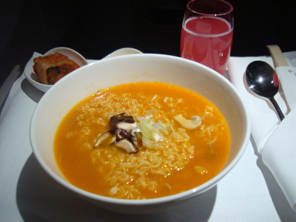 여기서 아시아나와 대한항공의 차이점! 대한항공의 경우 라면에 서브되는 반찬엔 김치가 없으나 아시아나엔 있습니다^^