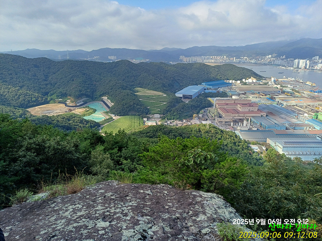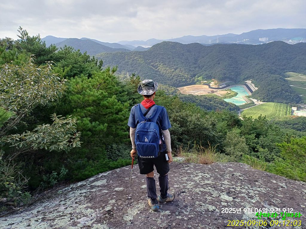 오른쪽 바위에 올라선다. 가까이 보이는 능선은 나중에 올라설 새방골산이다. 왼쪽 뒤에서 하늘 금을 그리는 능선은 낙남정맥.