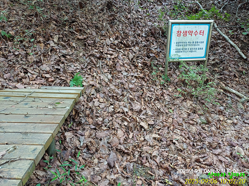 부서진 목교를 앞두고 오른쪽에 참샘약수터.