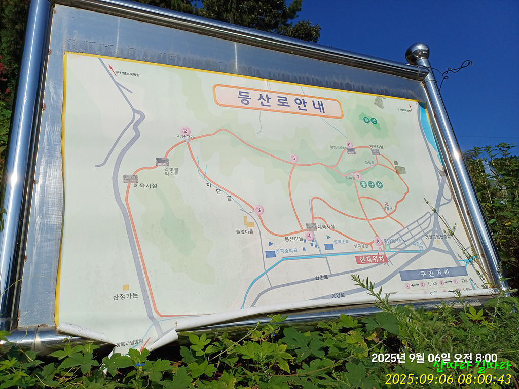 ◈산행구간 : 웅남동행정복지센터→삼거리→체육공원→뒷산 →참샘 →다시체육공원 → 동구산→아랫고개(지단고개)→육각정→약수터→산불감시초소→양곡소공원→양곡상가정류장