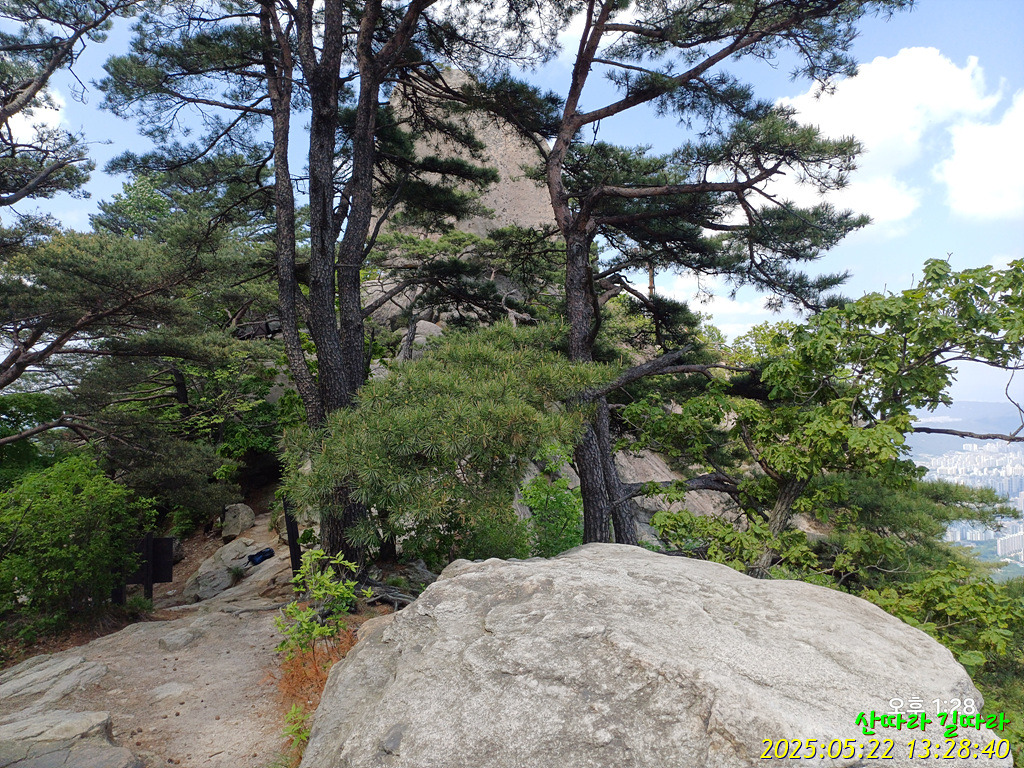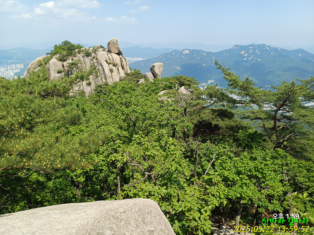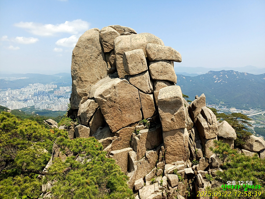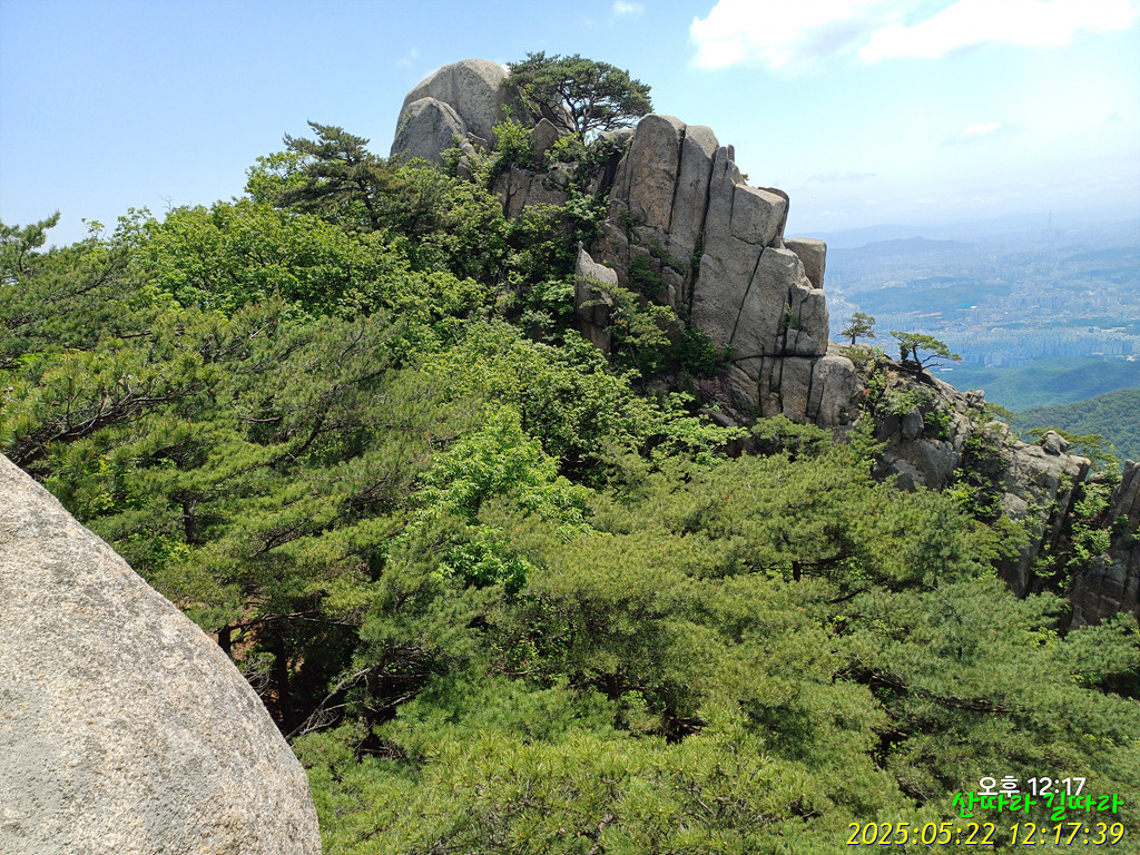 돌아본 암봉. 그 오른쪽 뒤로 북한산도 보인다.