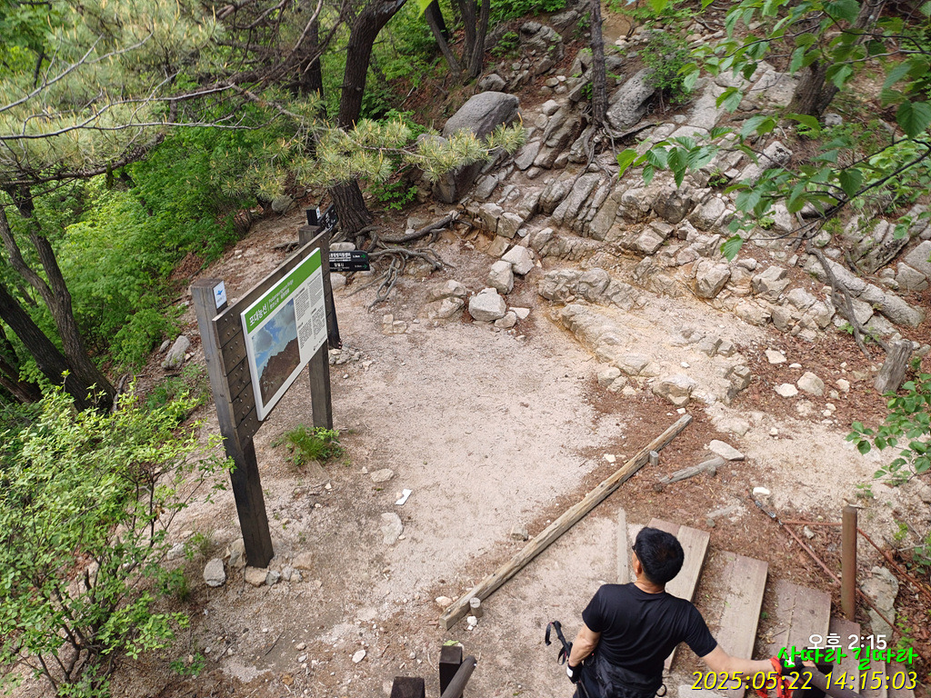 다시 만난 도봉산 안내판을 오른쪽 뒤로 보낸다. 왼쪽 위로 보이는 계단 끝은 오봉에서 올라온 안부. 그 오른쪽 봉은 왼쪽으로 우회한다.