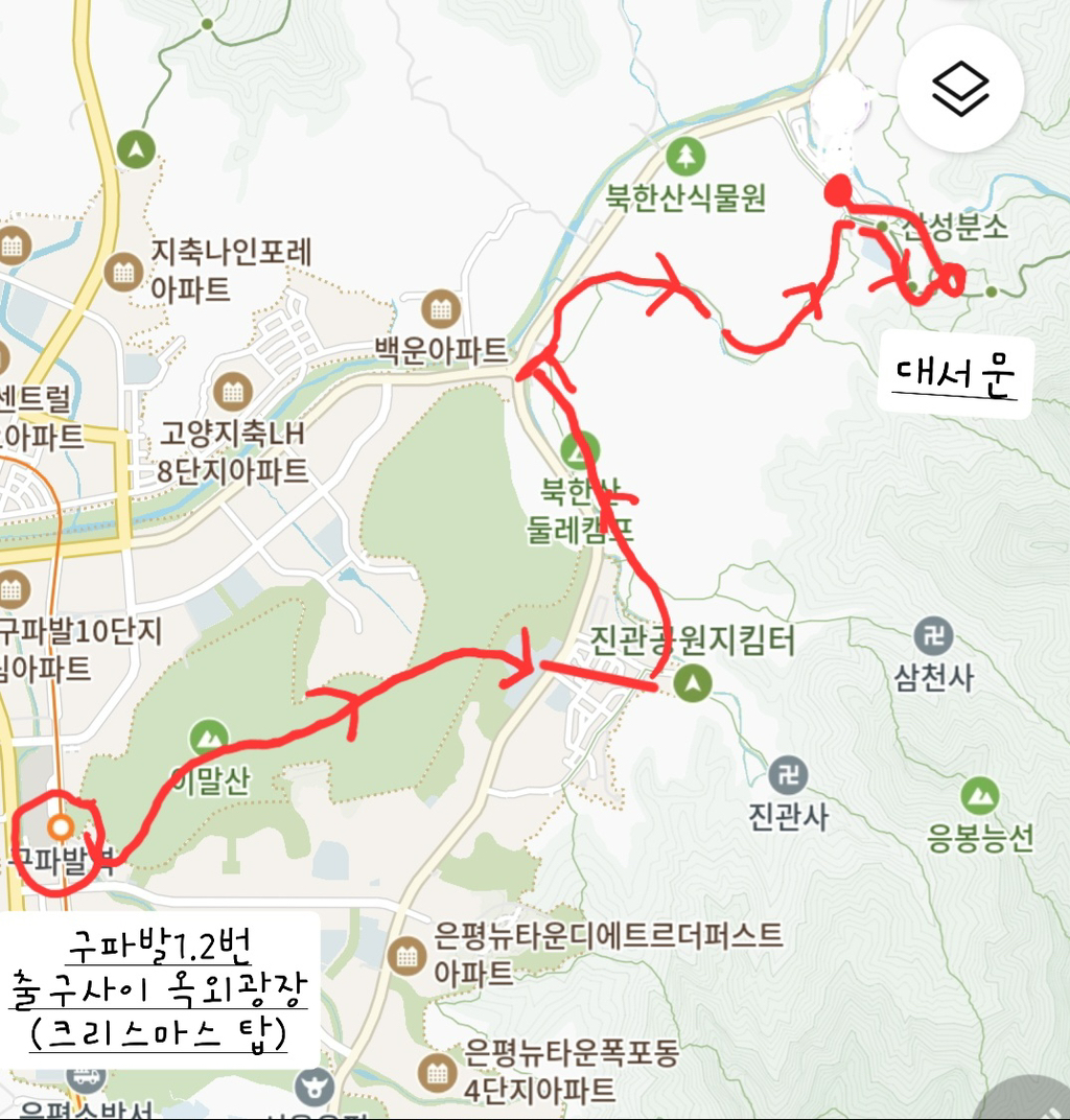 구파발역-구파발교회-이말산-한옥마을-북한산둘레길-백화사길-북한산탐방안내소-대서문(회귀)-서암사계곡길-탐방안내소