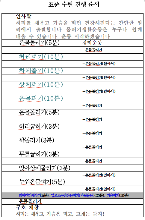 표준수련 진행 순서는 참고용(2017.12.18.) 작성자양미영|작성시간26.01.04|조회수59 목록 댓글 0 글자크기 작게가 글자크기 크게가 몸펴기로 바른자세, 함께 누리는 건강백세! 몸펴기생활운동 협회 이사회 결정사항입니다. 운동법 순서입니다. 2017년12월18일 조교.사범방에 김용주 연구소장님이 올리신 글입니다. 다음검색 현재 게시글 추가 기능 열기 북마크 공유하기 신고 센터로 신고 댓글 댓글 0 댓글쓰기 답글쓰기 댓글 리스트