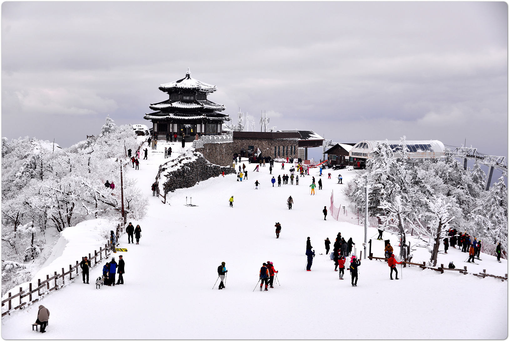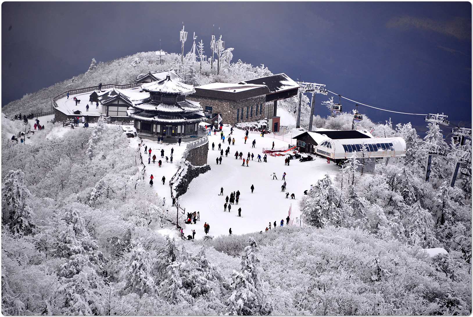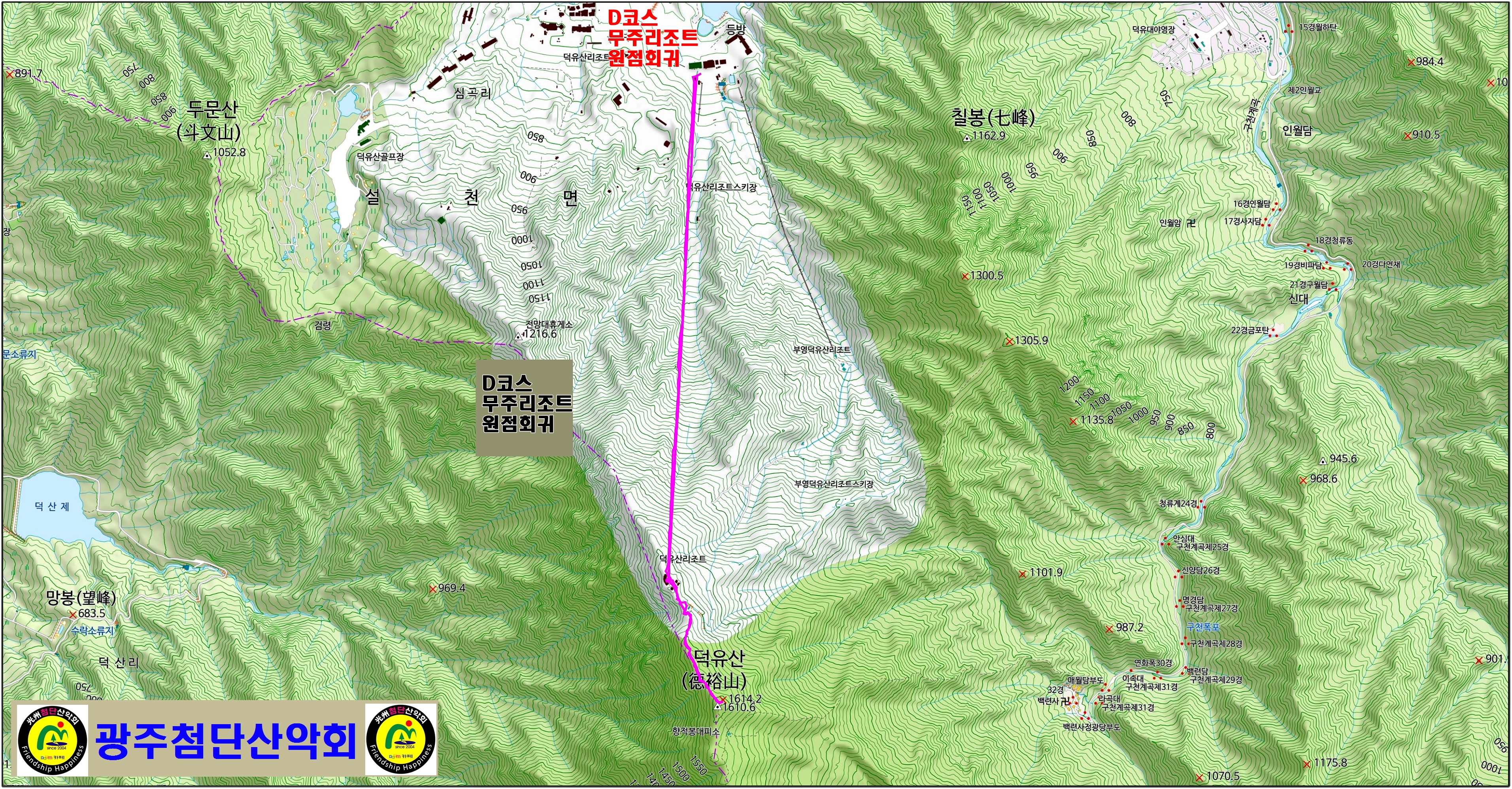 | D코스 | 무주리조트주차장(시작)→곤도라탑승→(약2.6km)→설천봉 상부승강장→ 상제루→향적봉→설천봉→곤도라탑승(하행)→무주리조트주차장(종료) | ||||||