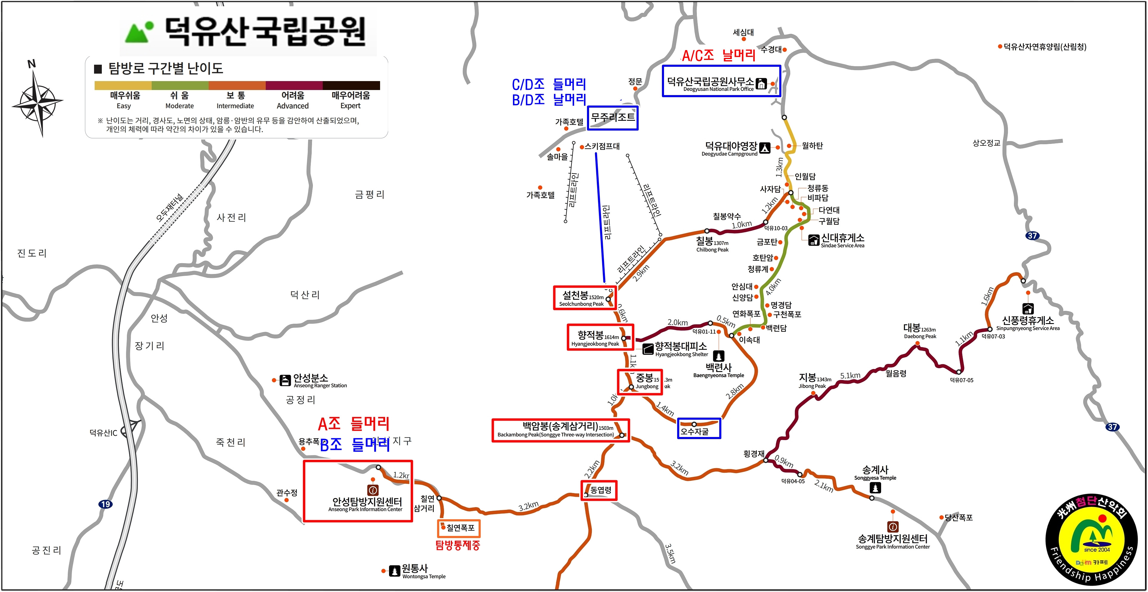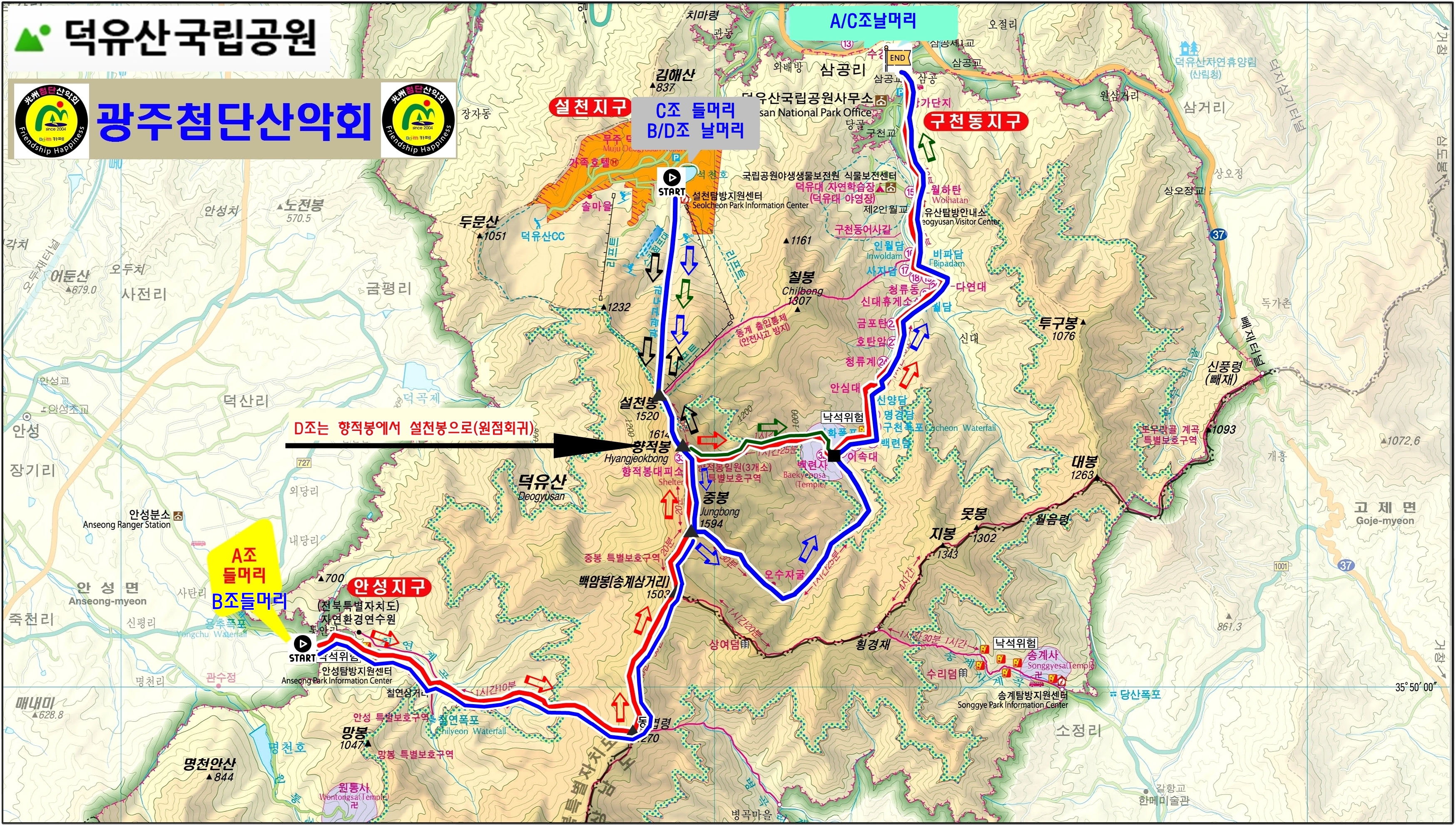 | 09:00~15:40 09:40~15:40 09:40~14:10 10:00~15:40 | 6시간 30분(A조) 5시간 30분 (B/C조) 5시간(D조) 5시간 40분(어사길) | 준비운동및 단체사진촬영후(10분) 즐거운 산행. | |||||