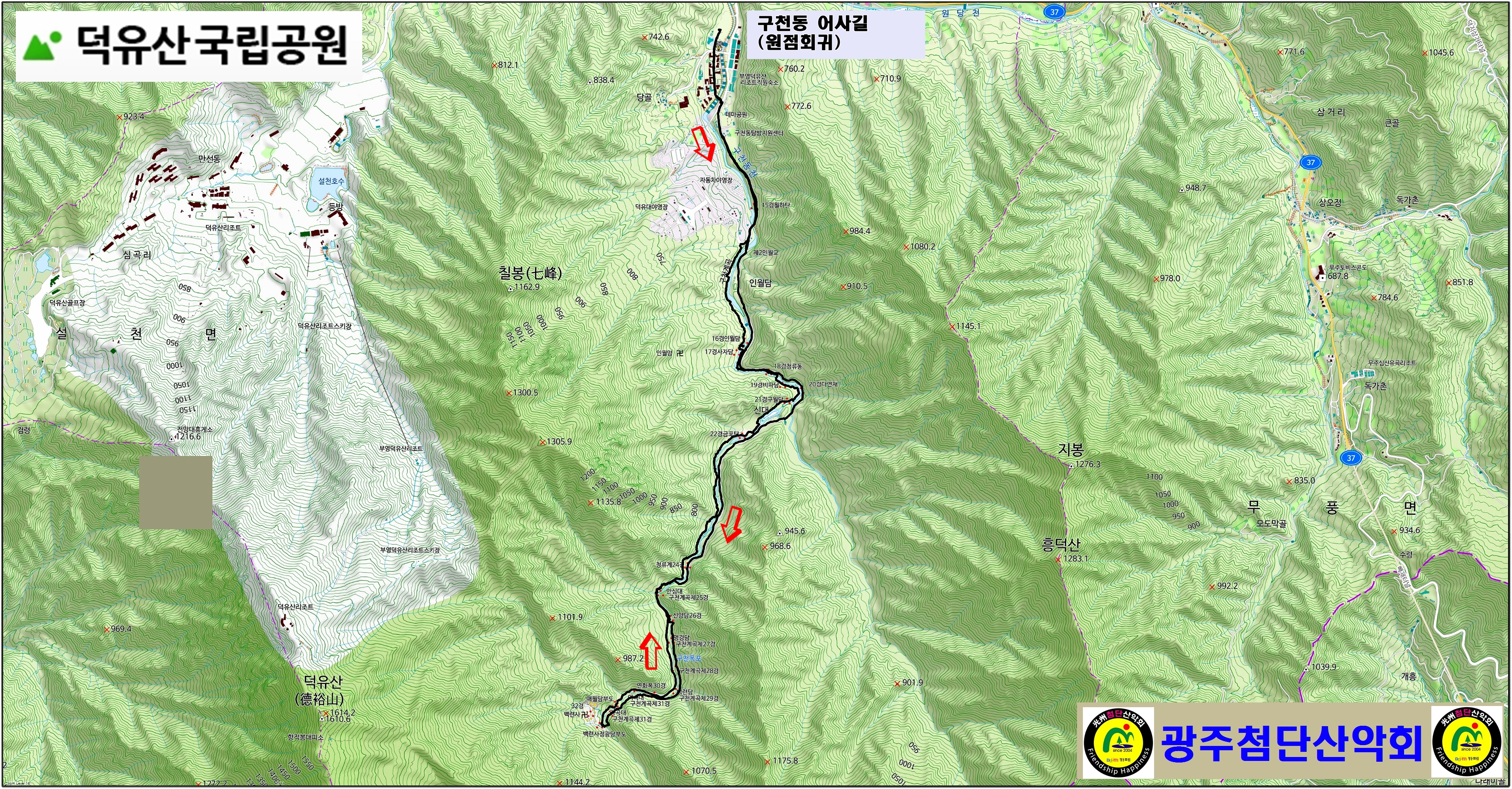구천동 어사길 | 삼공리주차장(시작)→덕유산탐방안내소→어사길초입→ 월하탄→인월담→비파담→구월담→안심대 → 신양담→명경담→구천폭포→백련사탐방→임도→ 덕유산탐방안내소→관광특구→삼공리주차장(도착) | ||||||