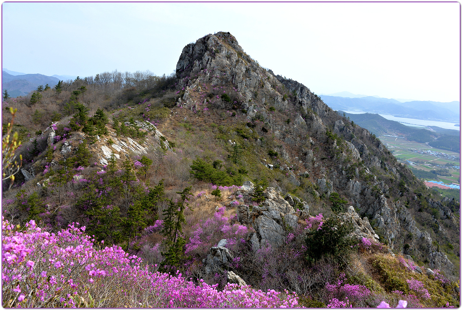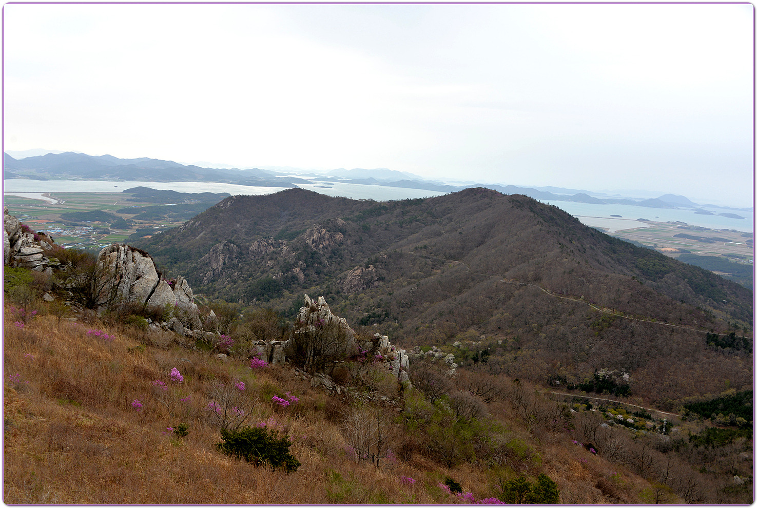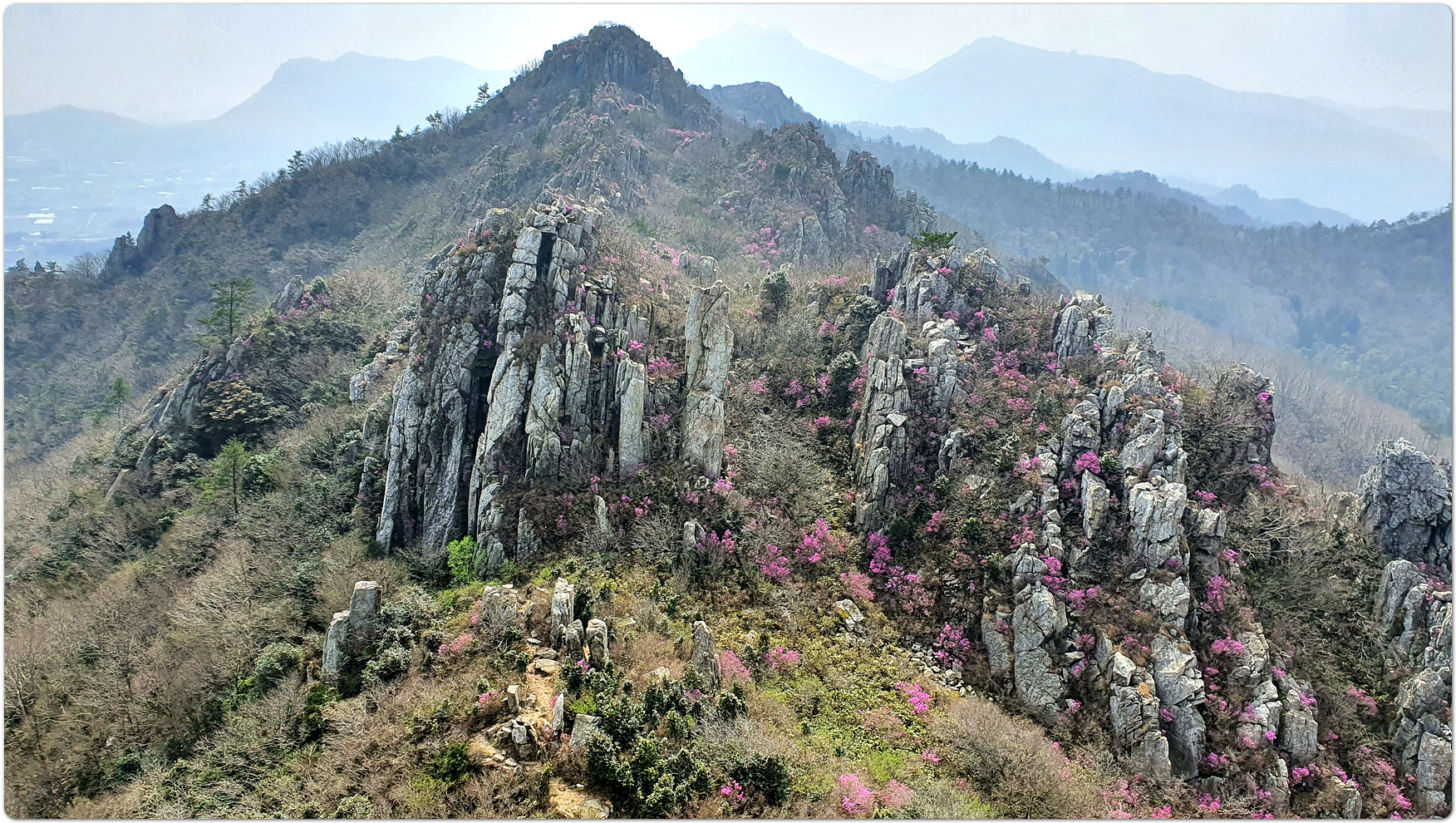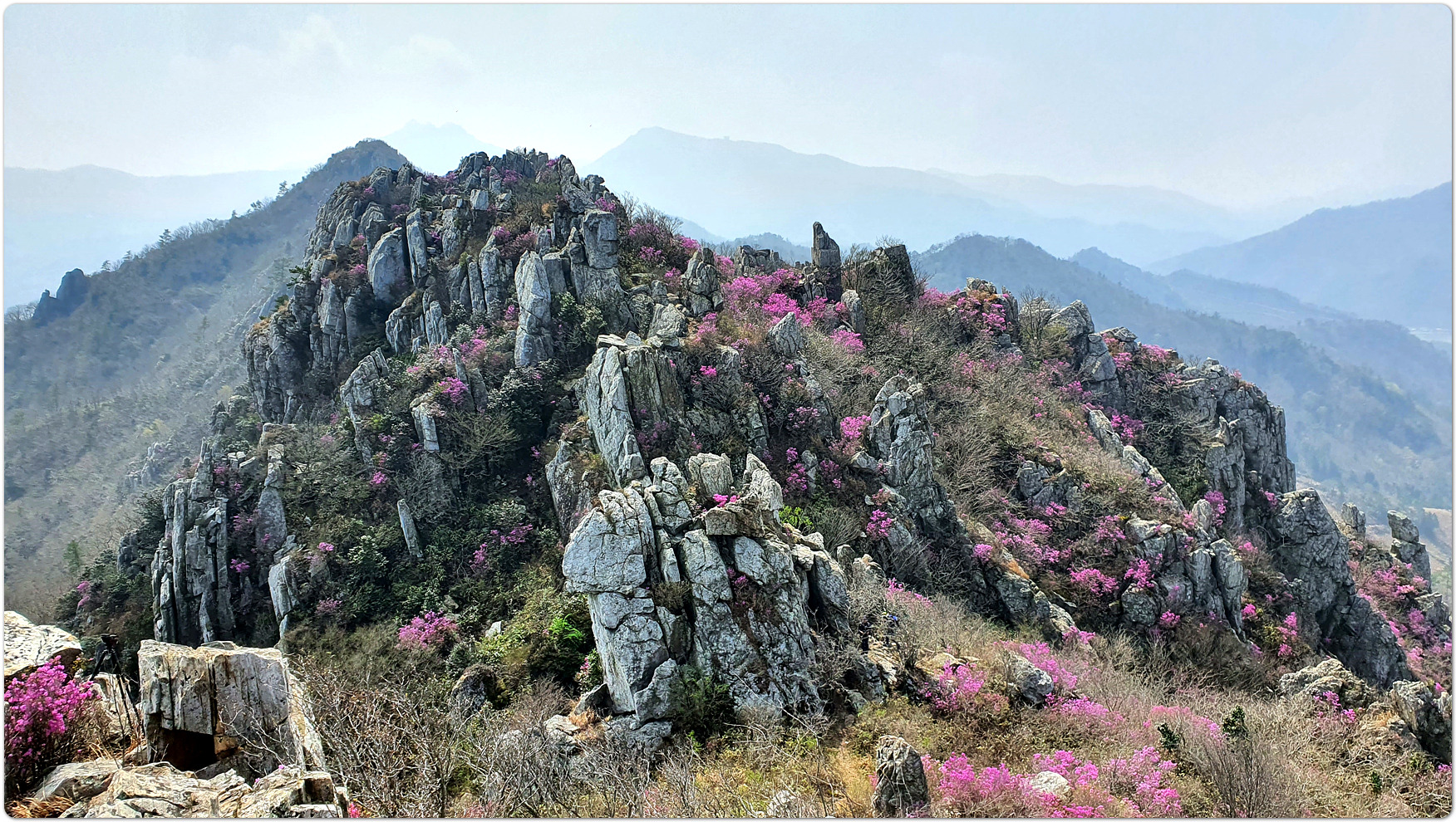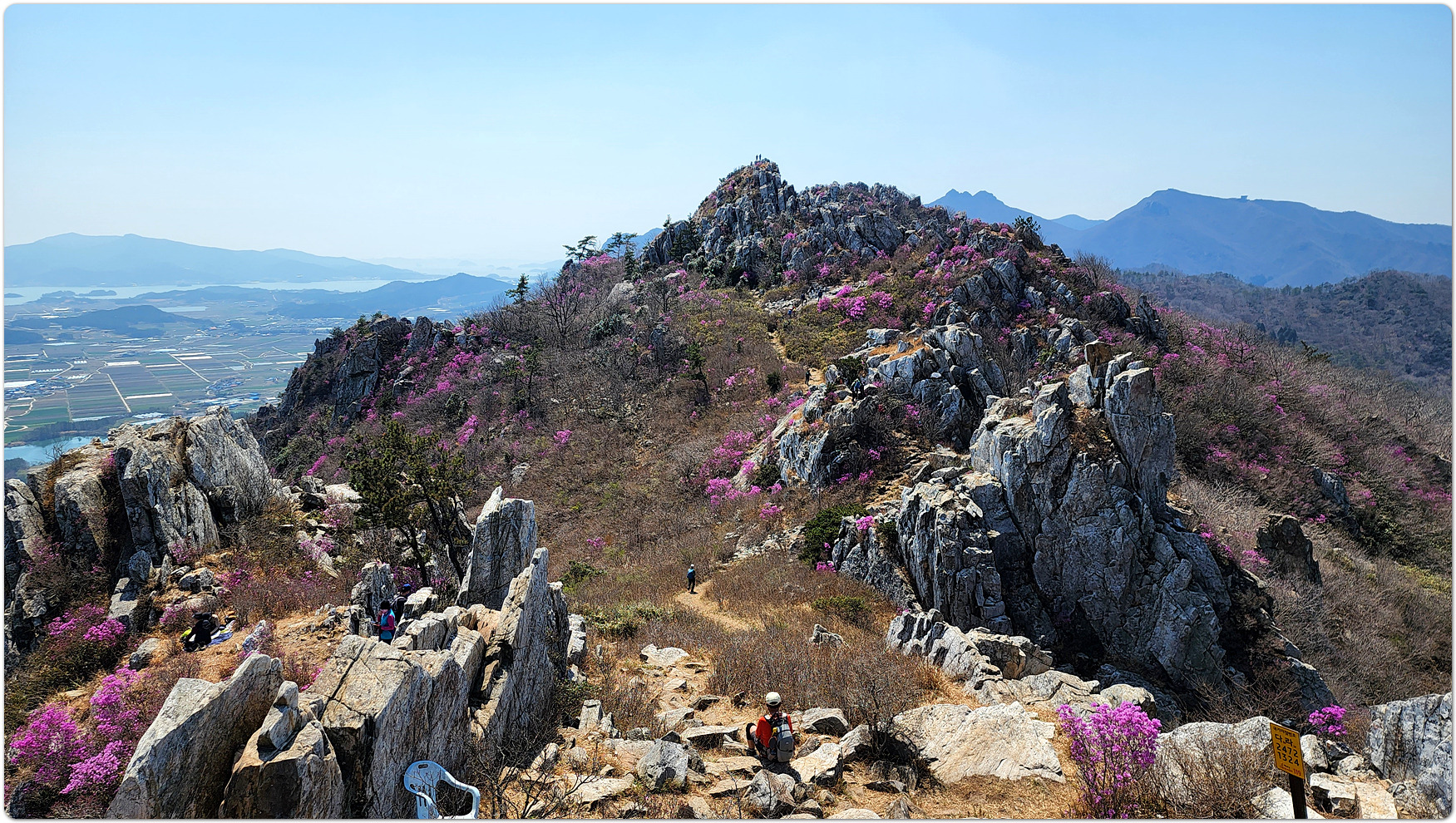 | 덕룡산과 주작산은 해발 400m대의 낮은 고도를 지녔지만, 거친 암릉과 빼어난 다도해 조망이 어우러져 산행의 묘미와 시각적인 즐거움을 동시에 선사하는 곳입니다. ▣ 덕룡산 (德龍山, 432m): 용이 꿈틀거리는 남도의 소금강 덕룡산은 이름 그대로 '덕스러운 용'이 힘차게 꿈틀거리며 비상하는 듯한 거친 암릉 지대를 품고 있습니다. ☞산세와 지형: 설악산의 공룡능선을 뚝 떼어다 남도 바닷가에 옮겨놓았다는 평가를 받으며 남도의 소금강','남도의 공룡능선'이라는 화려한 수식어를 자랑합니다. 동봉(420m)과 서봉(432m) 쌍봉을 중심으로 깎아지른 듯한 암봉들이 연달아 솟아 있어 고도표만 보고 만만하게 접근했다가는 큰코다치기 십상인 맹렬한 산세를 지녔습니다. ☞조망과 매력: 험난한 암릉을 오르내리는 내내 강진만과 완도, 해남 일대의 푸른 다도해 비경이 파노라마처럼 펼쳐집니다. 거친 바위와 부드러운 바다의 대비가 극적인 아름다움을 연출합니다. ☞역사적 정취: 산자락 주변으로는 다산 정약용 선생이 유배 생활을 했던 다산초당과 천연기념물 동백림으로 유명한 백련사 등 강진의 깊은 역사와 문화 유적지가 자리하고 있어, 능선을 걸으며 남도의 풍부한 인문학적 정취를 함께 느낄 수 있습니다. ▣ 주작산 (朱雀山, 428m): 붉은 봉황이 날개를 펴고 날아오르다 주작산은 산의 형세가 '붉은 봉황(朱雀)'이 날개를 활짝 펴고 강진만을 향해 날아오르는 모습을 닮았다고 하여 붙여진 이름입니다. ☞산세와 지형: 덕룡산과 맥을 같이 하지만, 그 느낌은 사뭇 다릅니다. 덕룡산이 남성적이고 거칠다면, 주작산은 날카로운 암릉 사이에 부드러운 억새능선과 흙길이 조화롭게 섞여 있습니다. 특히 주봉(428m)을 기점으로 오소재로 뻗어 내리는 암릉 구간은 봉황의 우측 날개에 해당하며, 톱니바퀴처럼 날카로운 바위 무리가 장관을 이룹니다. ☞계절의 백미: 주작산은 무엇보다 봄철 진달래 산행으로 전국적인 명성을 떨칩니다. 4월 초순이 되면 회백색의 거친 암봉들 사이로 붉은 진달래 군락이 융단처럼 피어나, 마치 봉황이 붉은 깃털을 뽐내는 듯한 황홀한 풍광을 빚어냅니다. ☞덕룡봉(475m)의 오해와 진실: 종주 코스 중에 만나는 가장 높은 봉우리인 덕룡봉(475m)은 행정구역 상 주작산에 속해 있어 종종 주작산 정상으로 오인받지만, 실제 주작산의 주봉은 작천소령 남쪽에 위치한 428m 봉우리(남주작산)입니다. 두 산을 하나로 엮는 연계 종주는 육체적인 고단함을 뛰어넘어, 한국의 산재한 명산들 중에서도 손꼽히는 성취감과 남도 특유의 진한 풍광을 안겨주는 훌륭한 코스입니다. 또한 풍수지리나 산세를 설명할 때 덕룡산과 주작산을 하나의 덩어리로 묶어서 "강진만을 향해 날아오르는 거대한 봉황"으로 비유하곤 합니다. 이를 부위별로 나누어 보면 다음과 같습니다. ◐봉황의 머리: 주작산 주봉 (남주작산, 428m) ◐봉황의 우측 날개: 작천소령에서 해남 오소재 방향으로 뻗어 내린 거친 암릉 구간 (주작산 톱니바퀴 능선) ◐봉황의 좌측 날개: 작천소령 북쪽에서 시작해 덕룡산 서봉, 동봉을 거쳐 소석문까지 이어지는 웅장한 암릉 구간 (덕룡산 능선) 즉, 첨단산악회 회원분들이 소석문에서 출발해 덕룡산의 동봉과 서봉을 넘고 작천소령까지 오시는 길이 거대한 봉황의 왼쪽 날개를 타고 올라오는 여정인 셈입니다. 그리고 작천소령을 기점으로 방향을 틀어 오소재로 내려가는 길이 오른쪽 날개를 타고 하산하는 길이 됩니다. 양쪽 날개 모두 기암괴석이 날카롭게 솟아오른 거친 바위산이라, "과연 전설 속 봉황의 깃털(암봉)을 밟고 지나는 길답다"라는 탄성을 자아내게 합니다. |