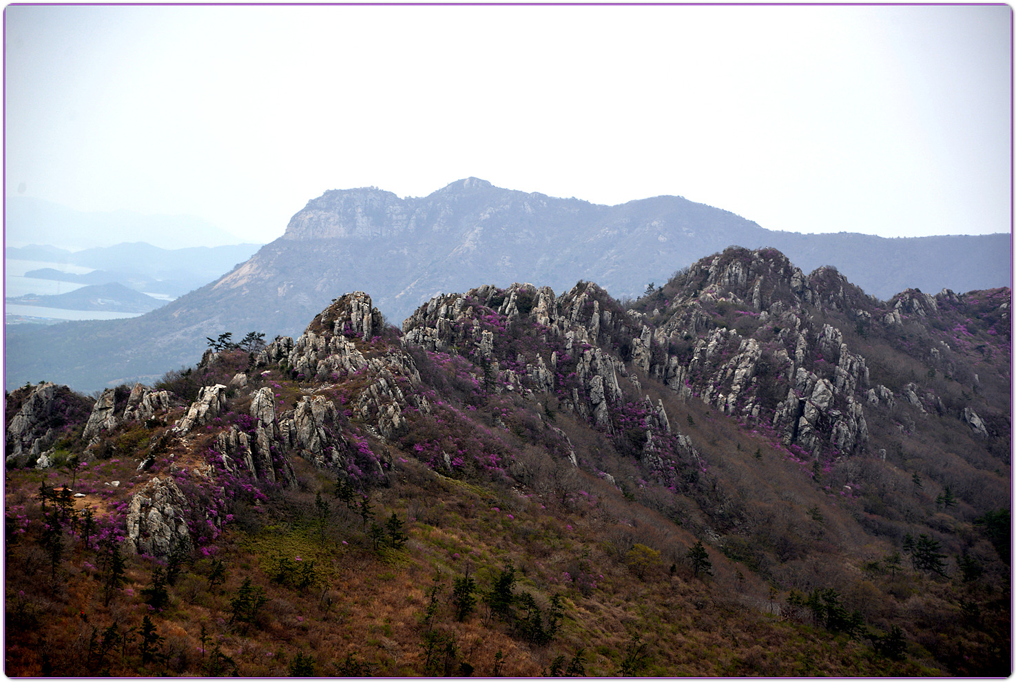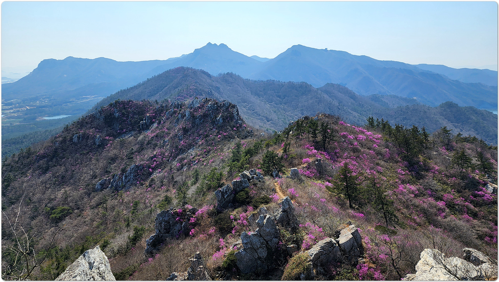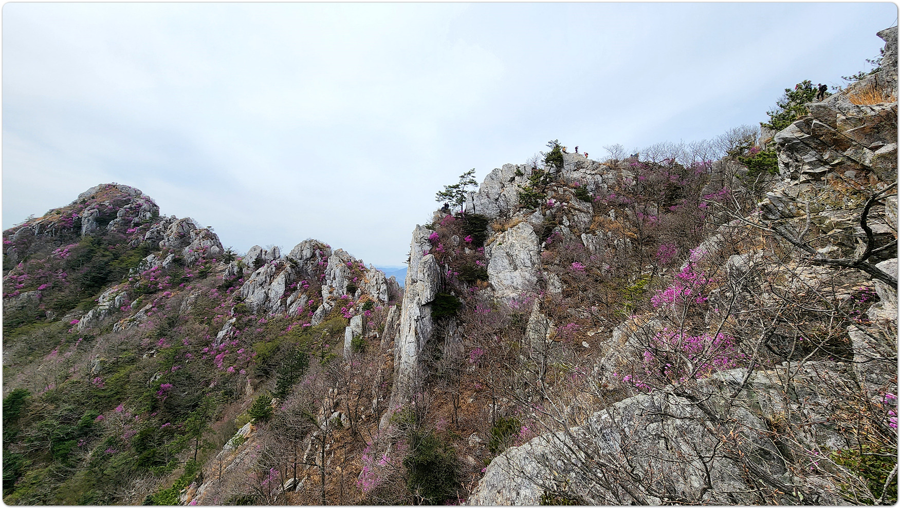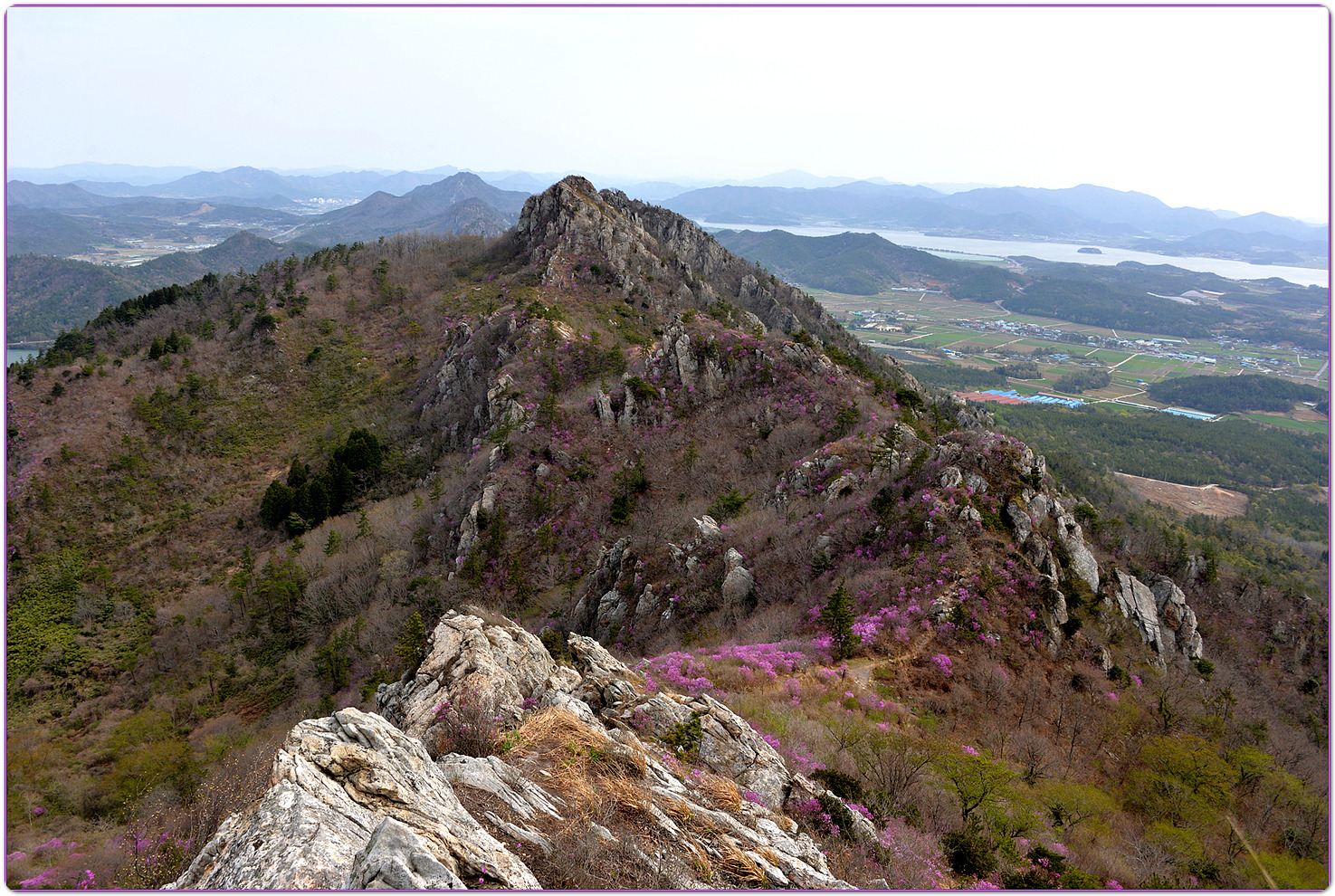 | 덕룡산과 주작산은 해발 400m대의 낮은 고도를 지녔지만, 거친 암릉과 빼어난 다도해 조망이 어우러져 산행의 묘미와 시각적인 즐거움을 동시에 선사하는 곳입니다. ▣ 덕룡산 (德龍山, 432m): 용이 꿈틀거리는 남도의 소금강 덕룡산은 이름 그대로 '덕스러운 용'이 힘차게 꿈틀거리며 비상하는 듯한 거친 암릉 지대를 품고 있습니다. ☞산세와 지형: 설악산의 공룡능선을 뚝 떼어다 남도 바닷가에 옮겨놓았다는 평가를 받으며 남도의 소금강','남도의 공룡능선'이라는 화려한 수식어를 자랑합니다. 동봉(420m)과 서봉(432m) 쌍봉을 중심으로 깎아지른 듯한 암봉들이 연달아 솟아 있어 고도표만 보고 만만하게 접근했다가는 큰코다치기 십상인 맹렬한 산세를 지녔습니다. ☞조망과 매력: 험난한 암릉을 오르내리는 내내 강진만과 완도, 해남 일대의 푸른 다도해 비경이 파노라마처럼 펼쳐집니다. 거친 바위와 부드러운 바다의 대비가 극적인 아름다움을 연출합니다. ☞역사적 정취: 산자락 주변으로는 다산 정약용 선생이 유배 생활을 했던 다산초당과 천연기념물 동백림으로 유명한 백련사 등 강진의 깊은 역사와 문화 유적지가 자리하고 있어, 능선을 걸으며 남도의 풍부한 인문학적 정취를 함께 느낄 수 있습니다. ▣ 주작산 (朱雀山, 428m): 붉은 봉황이 날개를 펴고 날아오르다 주작산은 산의 형세가 '붉은 봉황(朱雀)'이 날개를 활짝 펴고 강진만을 향해 날아오르는 모습을 닮았다고 하여 붙여진 이름입니다. ☞산세와 지형: 덕룡산과 맥을 같이 하지만, 그 느낌은 사뭇 다릅니다. 덕룡산이 남성적이고 거칠다면, 주작산은 날카로운 암릉 사이에 부드러운 억새능선과 흙길이 조화롭게 섞여 있습니다. 특히 주봉(428m)을 기점으로 오소재로 뻗어 내리는 암릉 구간은 봉황의 우측 날개에 해당하며, 톱니바퀴처럼 날카로운 바위 무리가 장관을 이룹니다. ☞계절의 백미: 주작산은 무엇보다 봄철 진달래 산행으로 전국적인 명성을 떨칩니다. 4월 초순이 되면 회백색의 거친 암봉들 사이로 붉은 진달래 군락이 융단처럼 피어나, 마치 봉황이 붉은 깃털을 뽐내는 듯한 황홀한 풍광을 빚어냅니다. ☞덕룡봉(475m)의 오해와 진실: 종주 코스 중에 만나는 가장 높은 봉우리인 덕룡봉(475m)은 행정구역 상 주작산에 속해 있어 종종 주작산 정상으로 오인받지만, 실제 주작산의 주봉은 작천소령 남쪽에 위치한 428m 봉우리(남주작산)입니다. 두 산을 하나로 엮는 연계 종주는 육체적인 고단함을 뛰어넘어, 한국의 산재한 명산들 중에서도 손꼽히는 성취감과 남도 특유의 진한 풍광을 안겨주는 훌륭한 코스입니다. 또한 풍수지리나 산세를 설명할 때 덕룡산과 주작산을 하나의 덩어리로 묶어서 "강진만을 향해 날아오르는 거대한 봉황"으로 비유하곤 합니다. 이를 부위별로 나누어 보면 다음과 같습니다. ◐봉황의 머리: 주작산 주봉 (남주작산, 428m) ◐봉황의 우측 날개: 작천소령에서 해남 오소재 방향으로 뻗어 내린 거친 암릉 구간 (주작산 톱니바퀴 능선) ◐봉황의 좌측 날개: 작천소령 북쪽에서 시작해 덕룡산 서봉, 동봉을 거쳐 소석문까지 이어지는 웅장한 암릉 구간 (덕룡산 능선) 즉, 첨단산악회 회원분들이 소석문에서 출발해 덕룡산의 동봉과 서봉을 넘고 작천소령까지 오시는 길이 거대한 봉황의 왼쪽 날개를 타고 올라오는 여정인 셈입니다. 그리고 작천소령을 기점으로 방향을 틀어 오소재로 내려가는 길이 오른쪽 날개를 타고 하산하는 길이 됩니다. 양쪽 날개 모두 기암괴석이 날카롭게 솟아오른 거친 바위산이라, "과연 전설 속 봉황의 깃털(암봉)을 밟고 지나는 길답다"라는 탄성을 자아내게 합니다. |