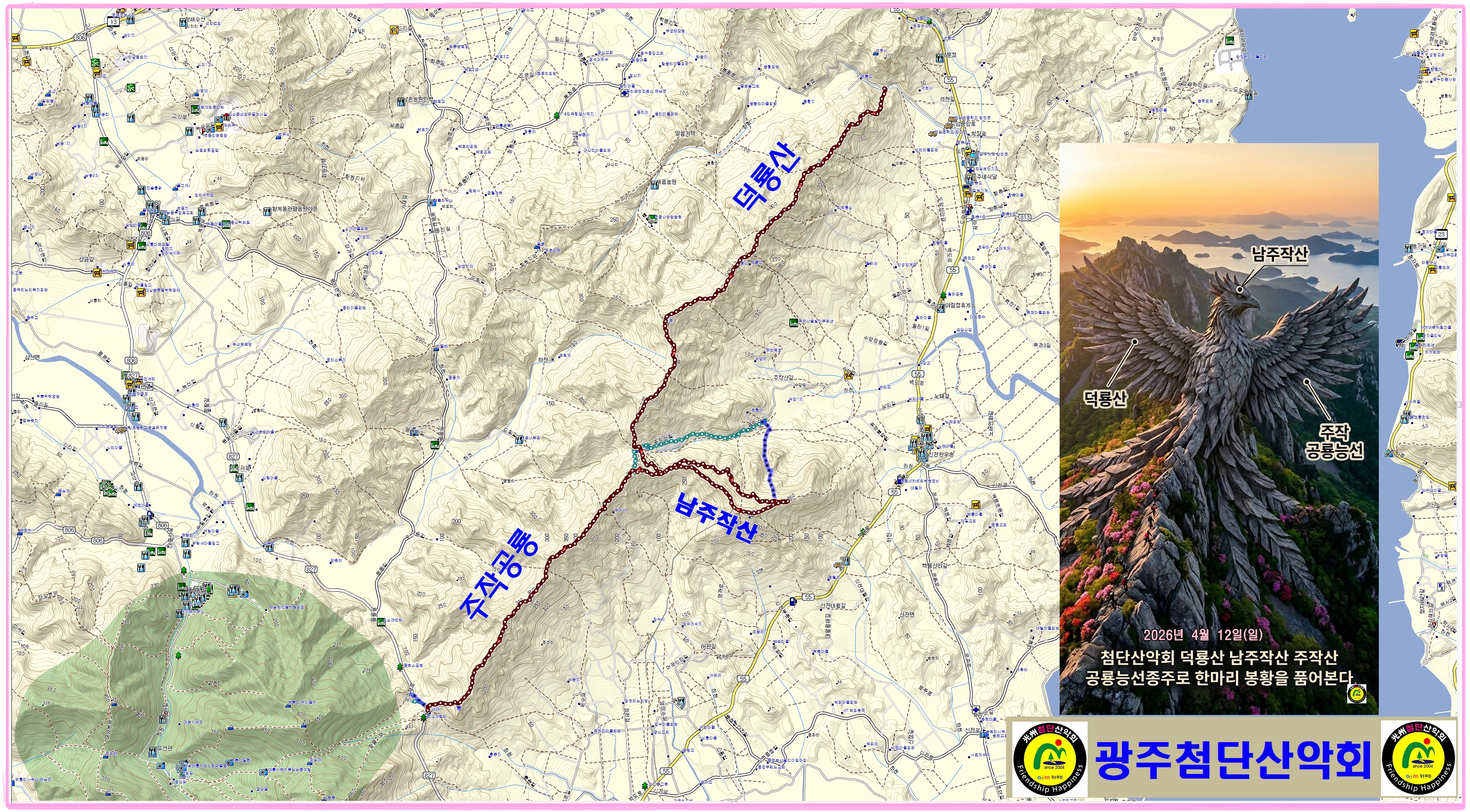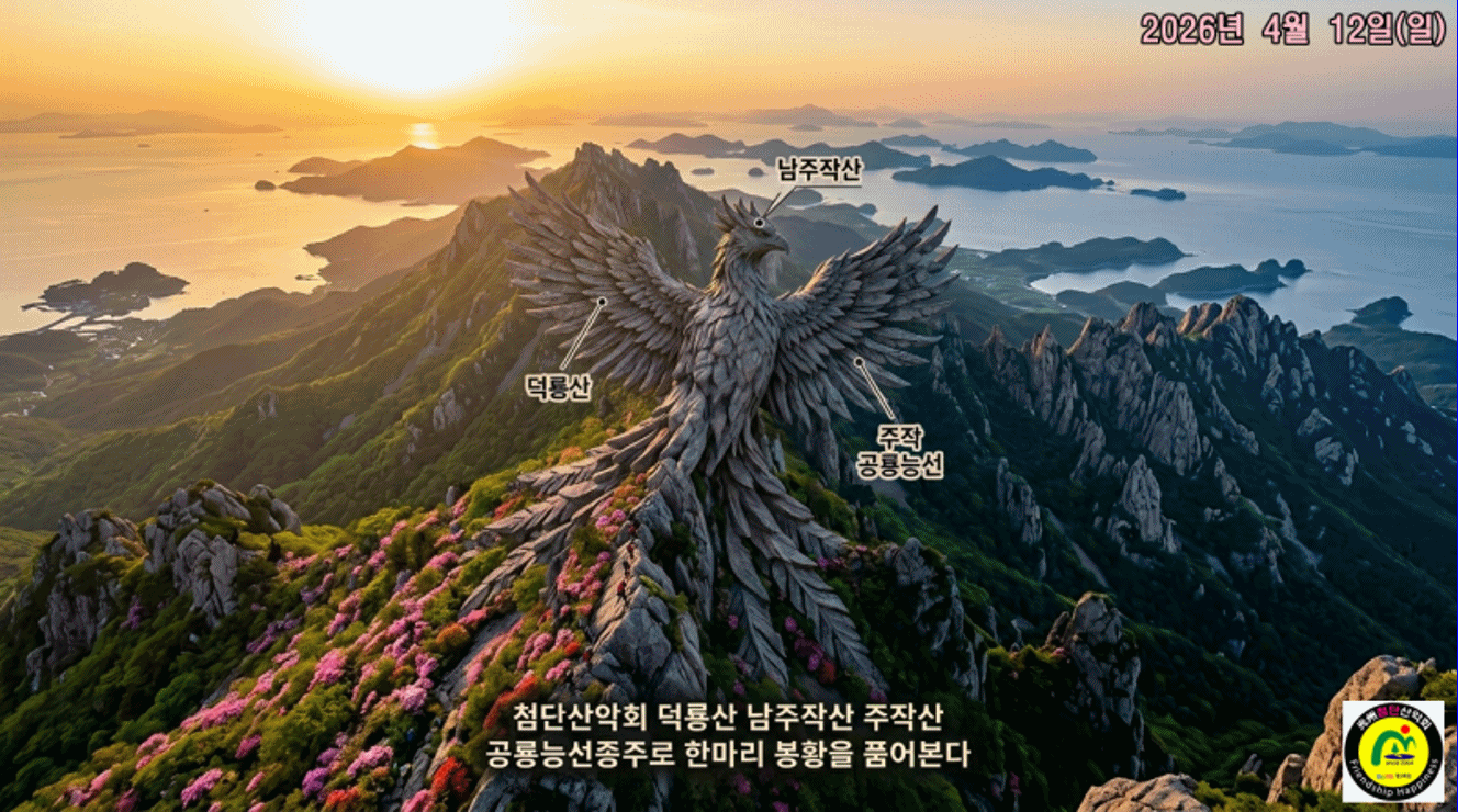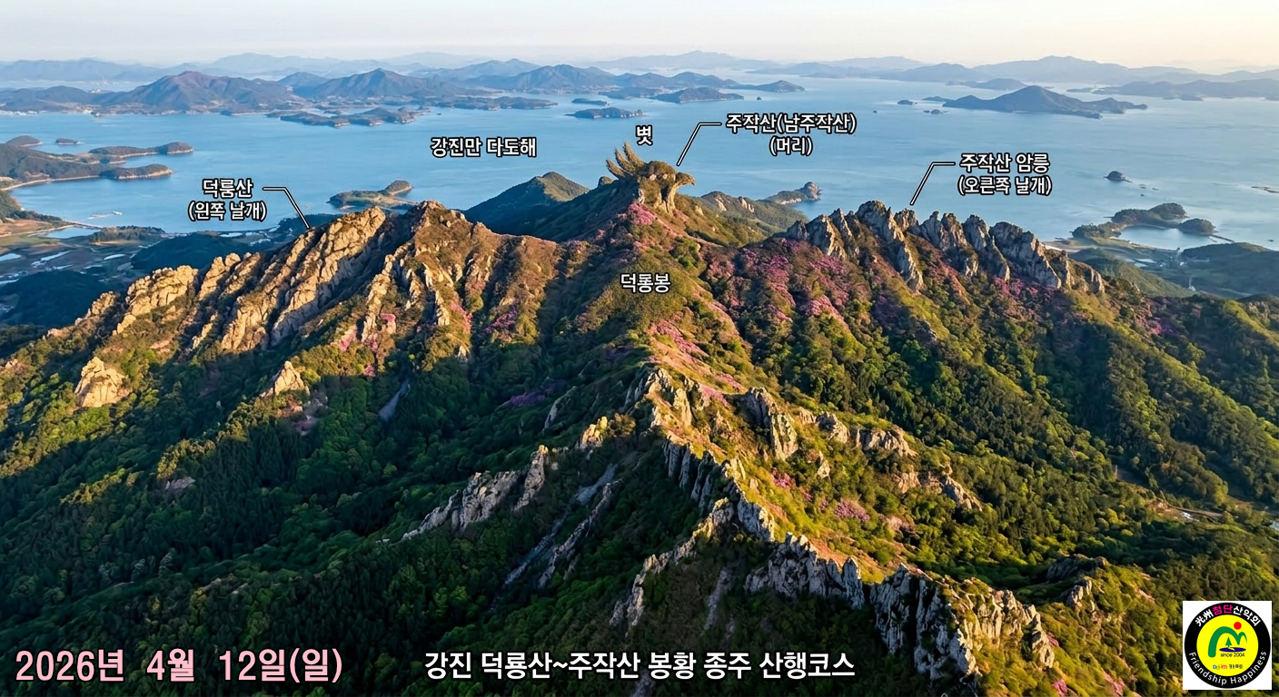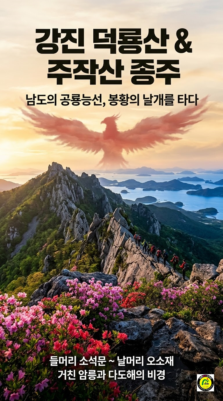 | “남도의 공룡능선, 붉게 타오르는 한 마리 봉황을 품다!” 봄의 절정! 거친 암봉 사이로 붉은 진달래가 융단처럼 피어나는 4월입니다. 이번 산행은 강진만을 향해 비상하는 거대한 봉황의 형상을 띤 덕룡산과 주작산 연계 종주입니다. 해발 400m대의 높이지만 설악산 공룡능선에 버금가는 웅장한 암릉과 아찔한 고도감을 자랑하는 호남 최고의 명품 코스입니다. 봉황의 좌측 날개(덕룡산)를 타고 올라, 머리(남주작산)를 거쳐, 우측 날개(주작 공룡능선)로 내려오는 장엄한 여정에 회원 여러분을 초대합니다. |